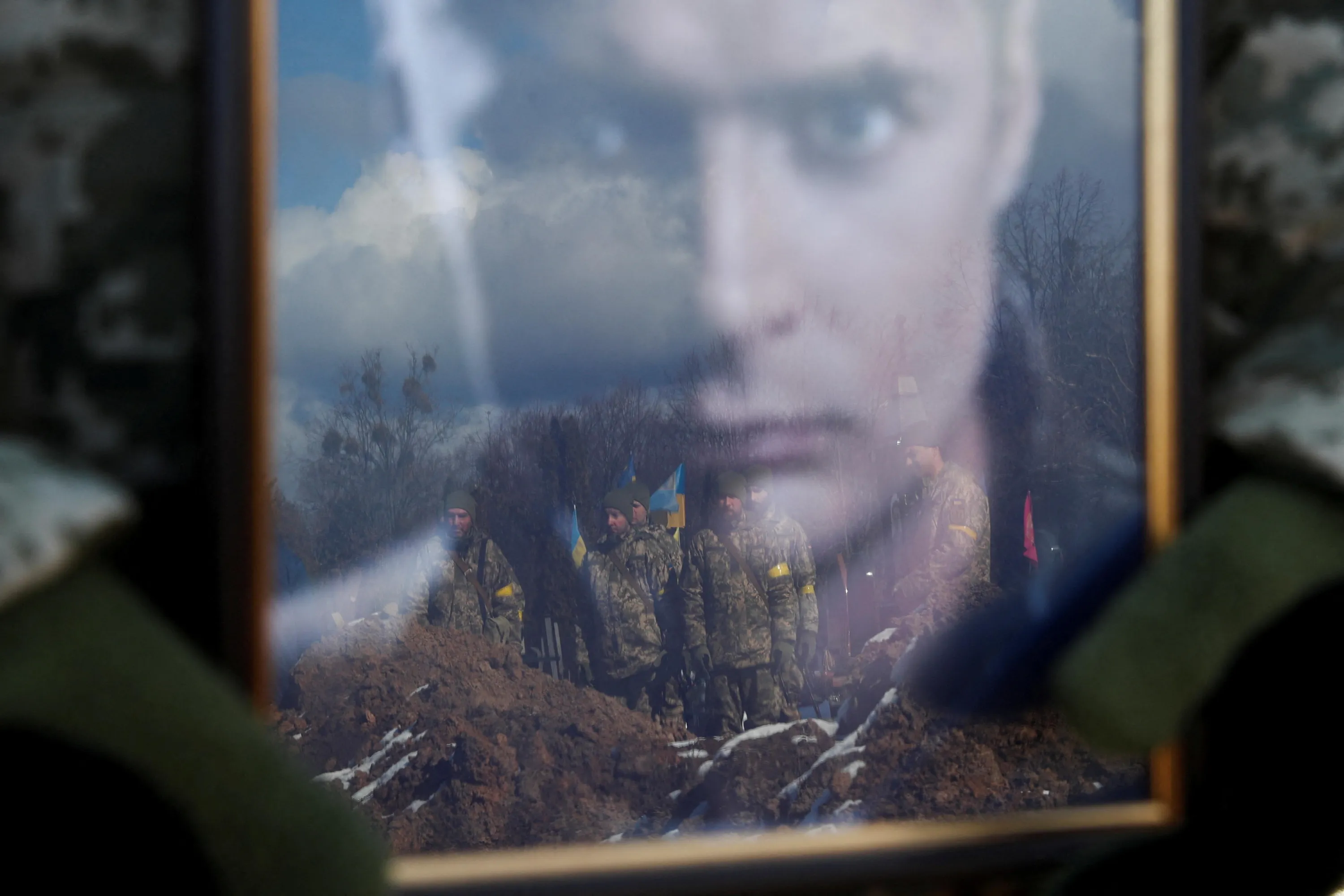 A member of the Honour Guard holds a portrait of the member of the Ukrainian Armed Forces, Valerii, who was killed during Russia's invasion of Ukraine, during a funeral ceremony in Kyiv, Ukraine, March 8, 2022. (Photo by Valentyn Ogirenko/Reuters)
