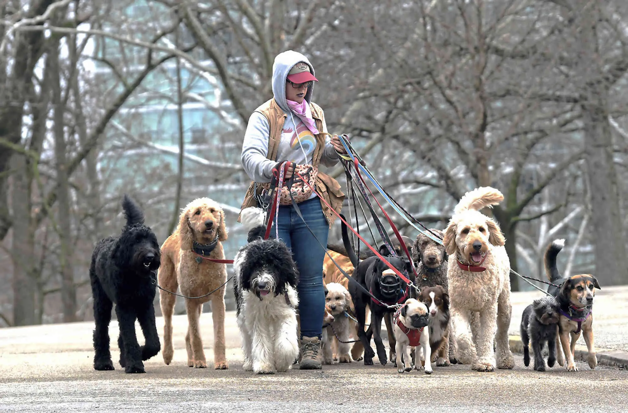 Kitaira Stotler, owner of Kitaira Walks Your Dog, walks 15 dogs around Highland Park, Wednesday, March 23, 2022, in Pittsburgh. (Photo by Pittsburgh Post-Gazette via AP Photo)