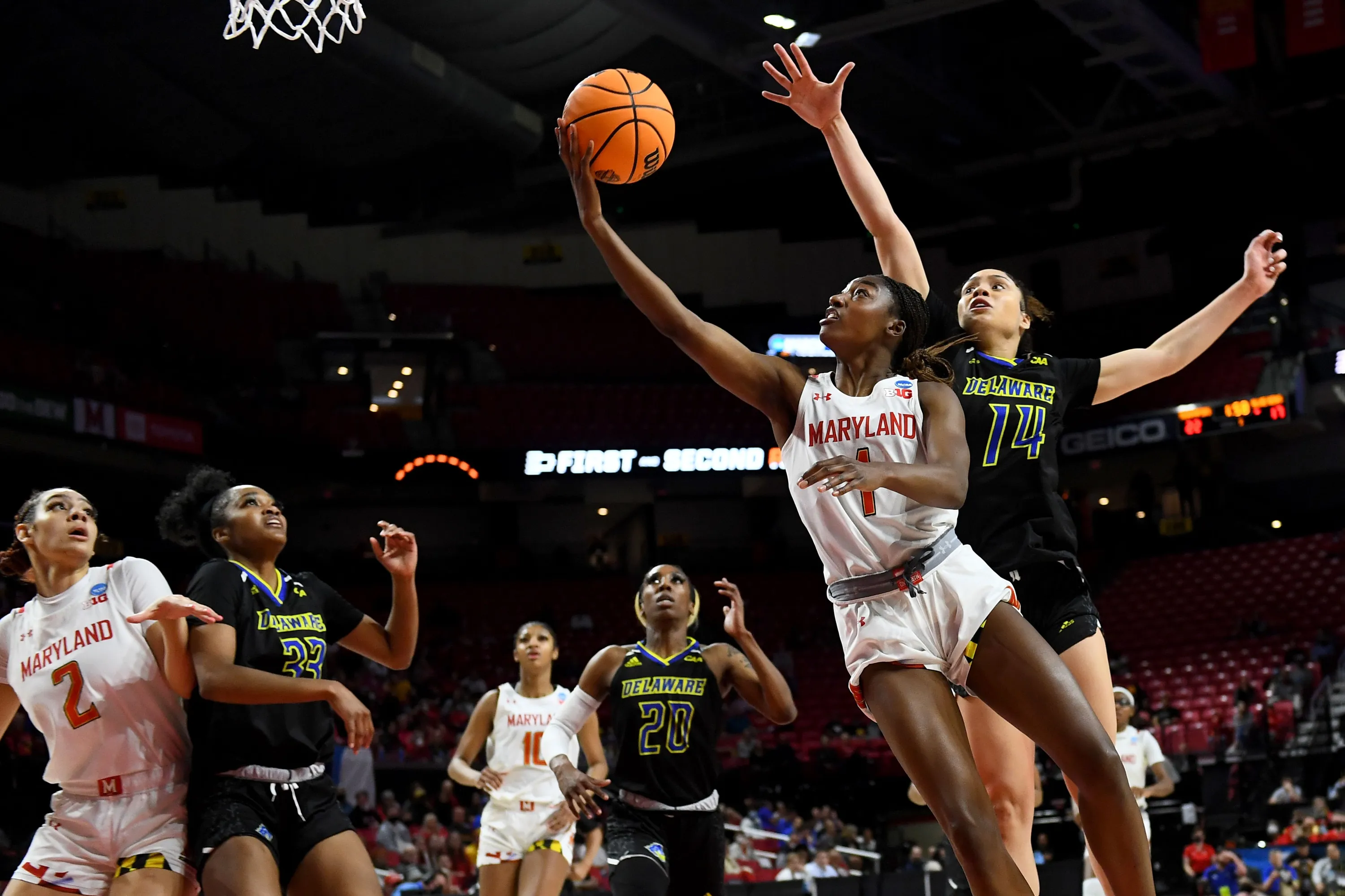 Maryland Terrapins guard Diamond Miller (1) goes up for two ahead of Delaware Blue Hens guard Makayla Pippin (14) in the first quarter at Xfinity Center March 18, 2022 in College Park, MD. (Photo by Katherine Frey/The Washington Post)