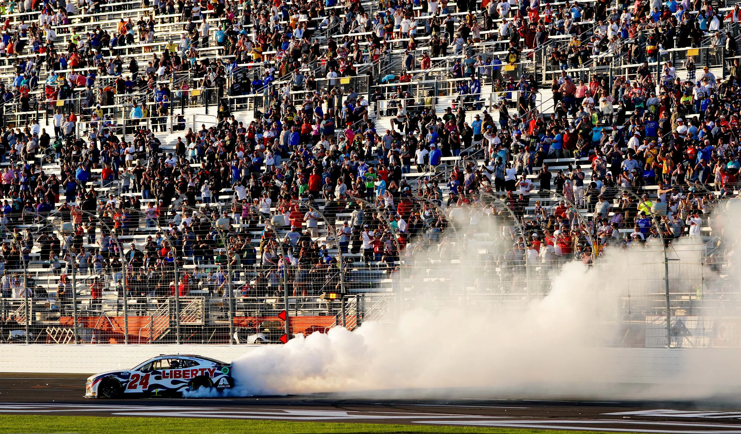 NASCAR Cup Series driver William Byron (24) performs a burnout as he celebrates winning the Folds of Honor QuikTrip 500 at Atlanta Motor Speedway in Hampton, Georgia on March 20, 2022. (Photo by John David Mercer/USA TODAY Sports)