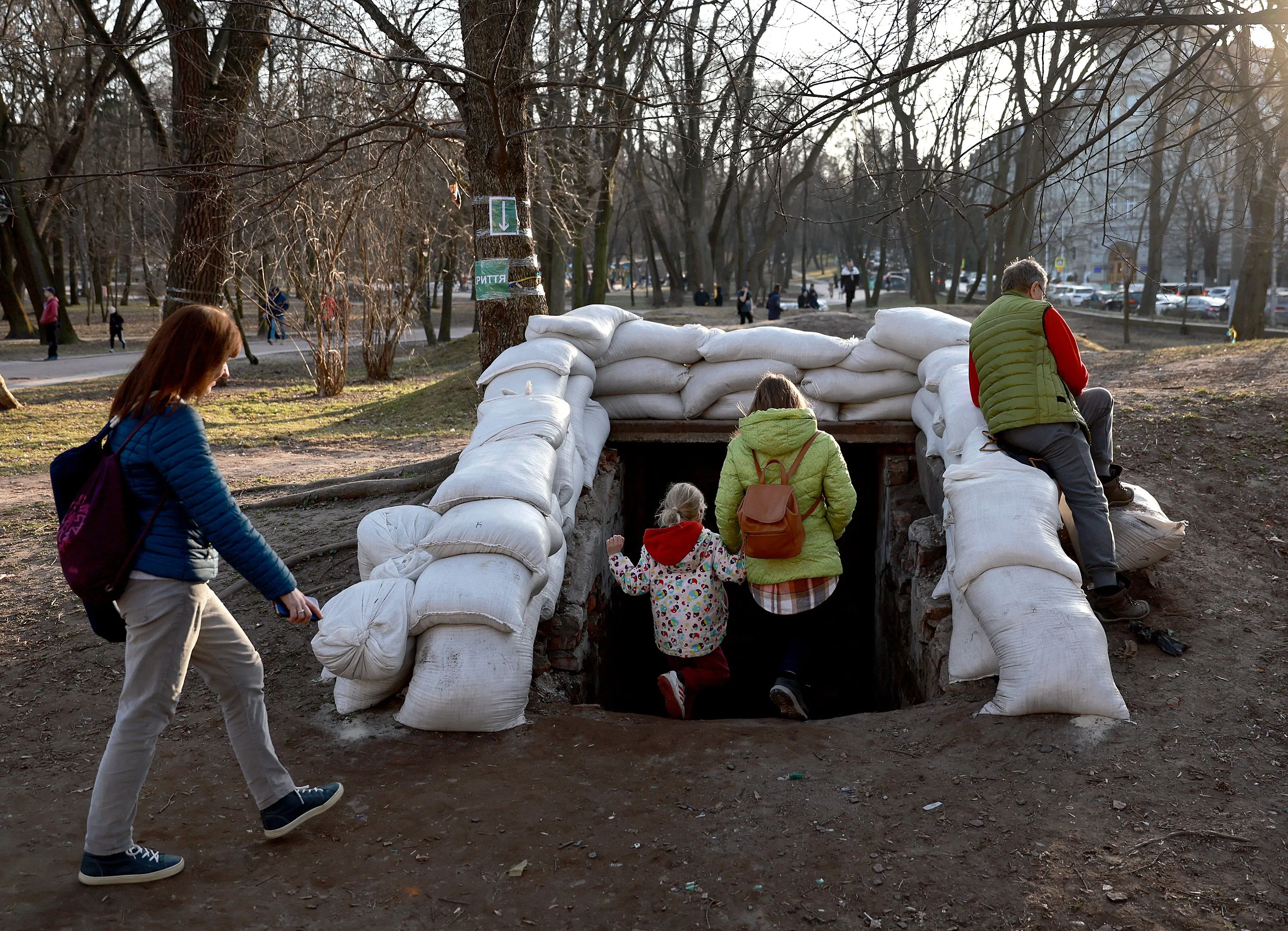 People walk down the sandbagged entrance to a bomb shelter after air raid sirens sounded on March 25, 2022 in Lviv, Ukraine. Lviv has served as a stopover and shelter for the millions of Ukrainians fleeing the Russian invasion, either to the safety of nearby countries or the relative security of western Ukraine. (Photo by Joe Raedle/Getty Images)