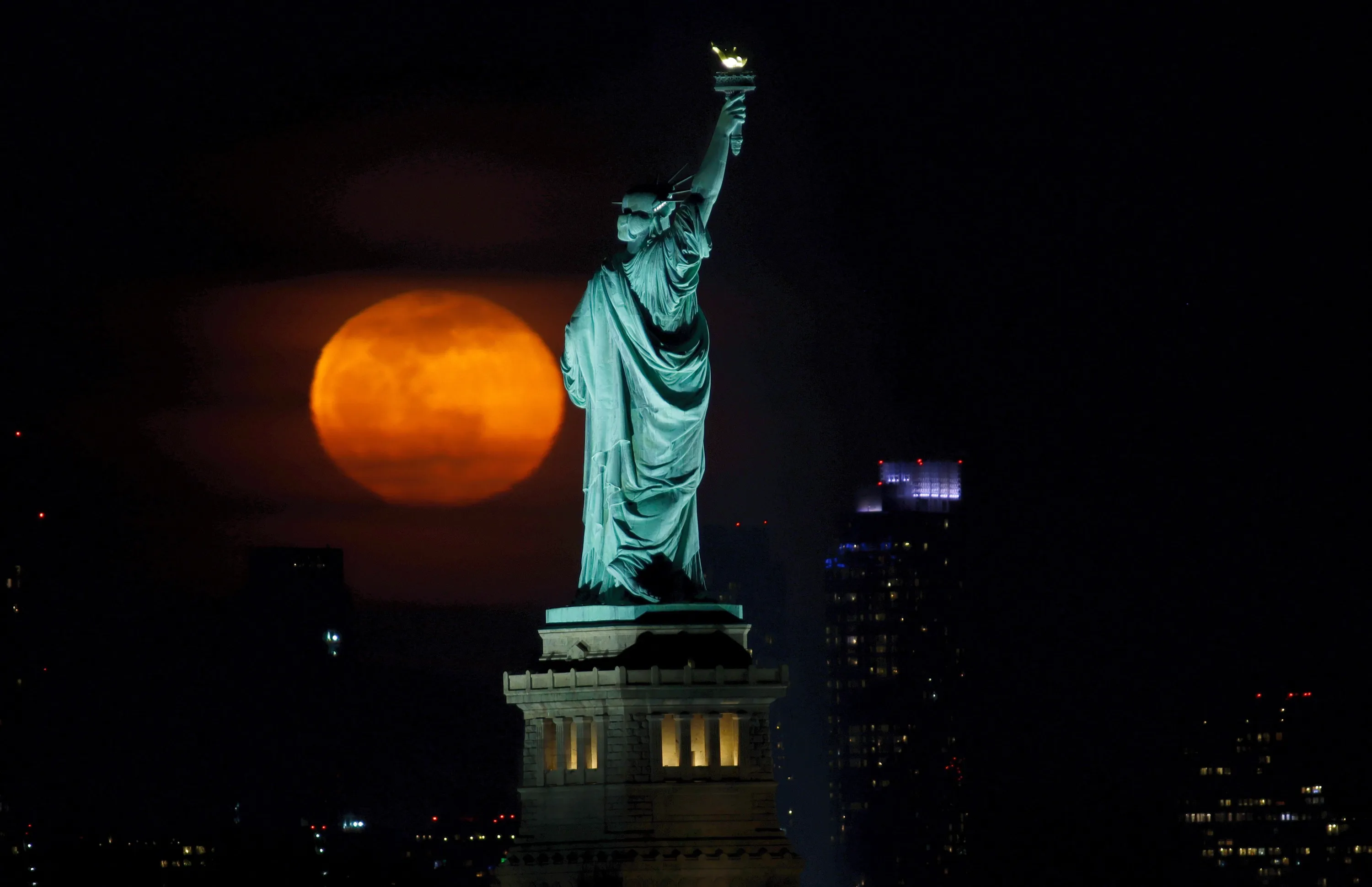 The full Worm Moon rises behind the Statue of Liberty in New York City on March 18, 2022, as seen from Jersey City, New Jersey. (Photo by Gary Hershorn/Getty Images)