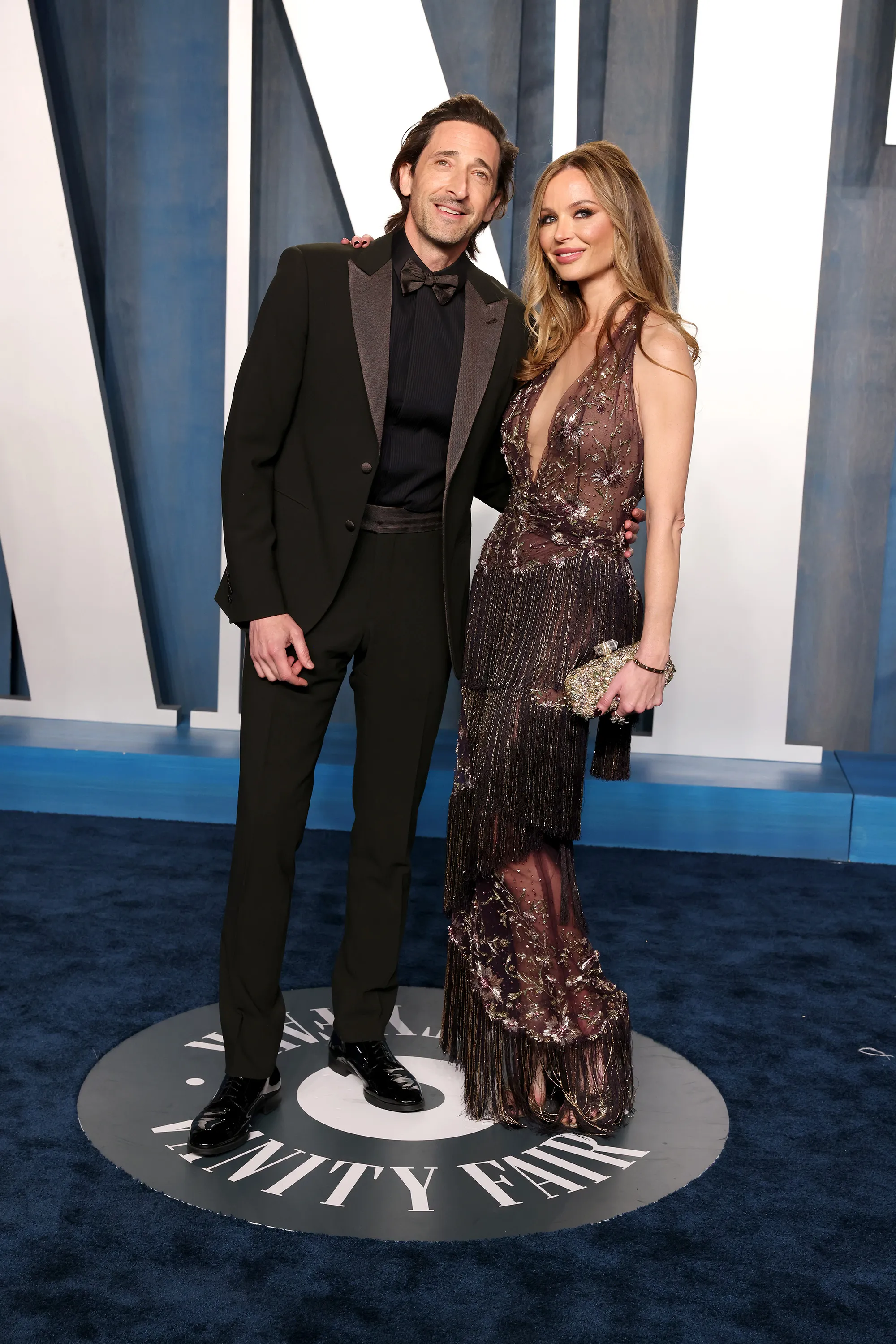 (L-R) American actor Adrien Brody and English fashion designer and actress Georgina Chapman attend the 2022 Vanity Fair Oscar Party hosted by Radhika Jones at Wallis Annenberg Center for the Performing Arts on March 27, 2022 in Beverly Hills, California. (Photo by John Shearer/Getty Images)