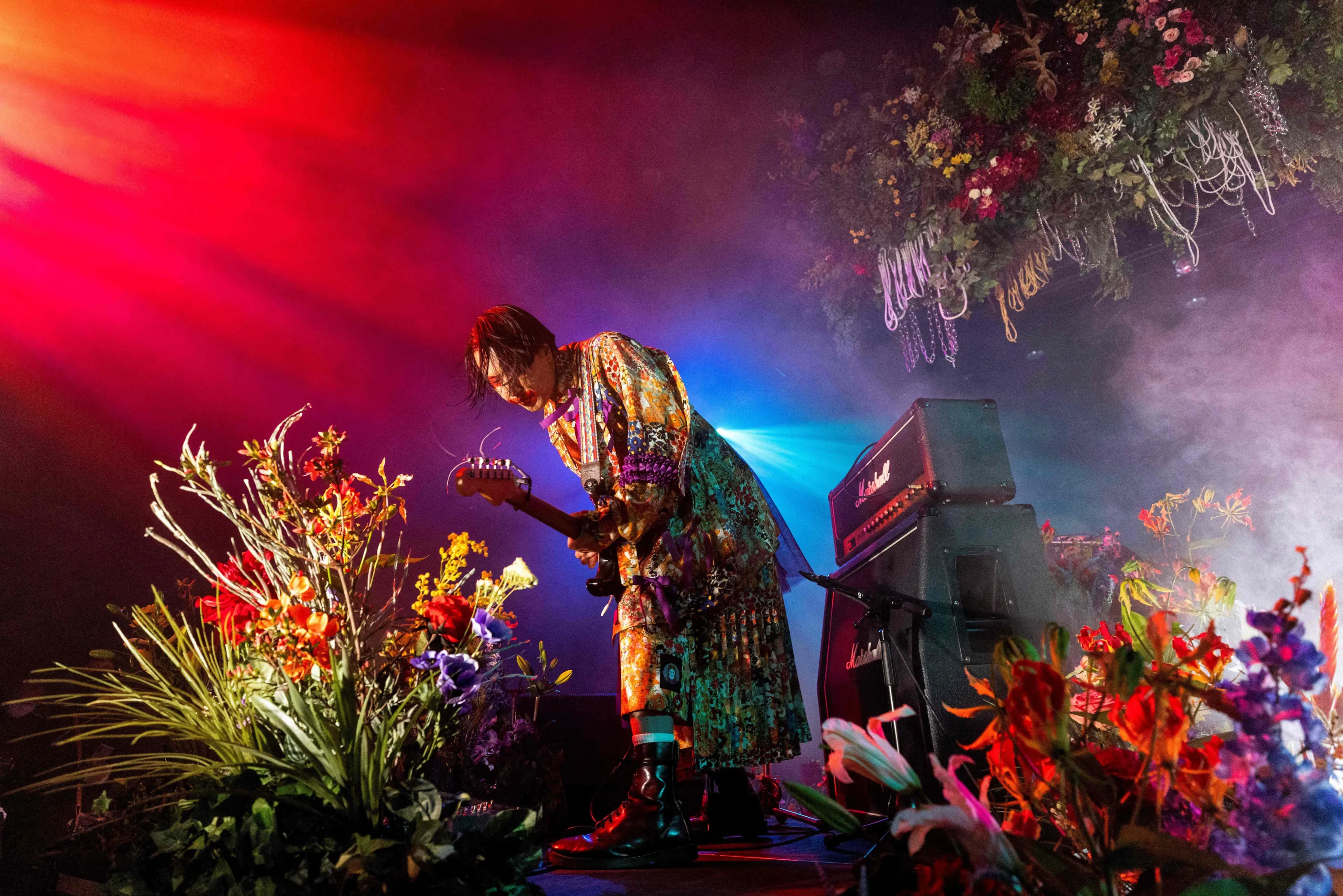 A member of heavy metal music band Psysalia, wearing a creation from fashion brand KIDILL by designer Hiroaki Sueyasu, performs during the 2022 autumn/winter Tokyo Fashion Week in Tokyo on March 15, 2022. (Photo by Behrouz Mehri/AFP Photo)