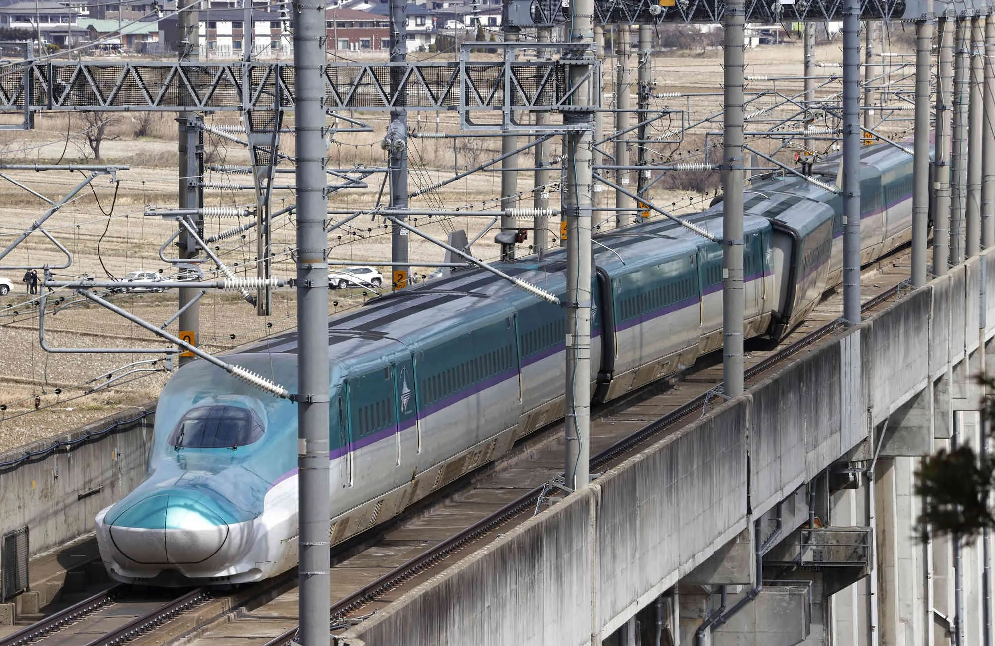 A partially derailed express train sits following an earthquake in Shiroishi, Miyagi prefecture, northern Japan Thursday, March 17, 2022. A powerful earthquake struck off the coast of Fukushima in northern Japan on Wednesday night, smashing furniture, knocking out power and killing some people. A small tsunami reached shore, but the low-risk advisory was lifted by Thursday morning. (Photo by Kyodo News via AP Photo)