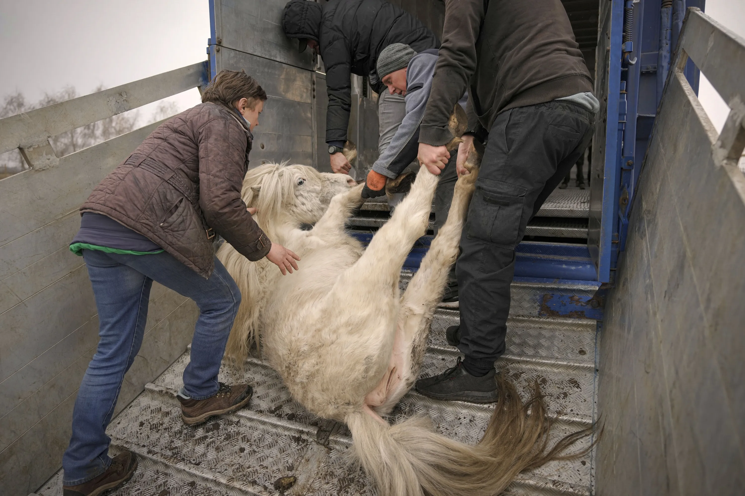 Volunteers drag a pony that collapsed due to stress on a truck at a heavily damaged private zoo while attempting to evacuate the surviving animals to safety in the village of Yasnohorodka, on the outskirts of Kyiv, Ukraine, Wednesday, March 30, 2022. The evacuation was halted before completion as shelling resumed between Russian and Ukrainian forces in the area. (Photo by Vadim Ghirda/AP Photo)
