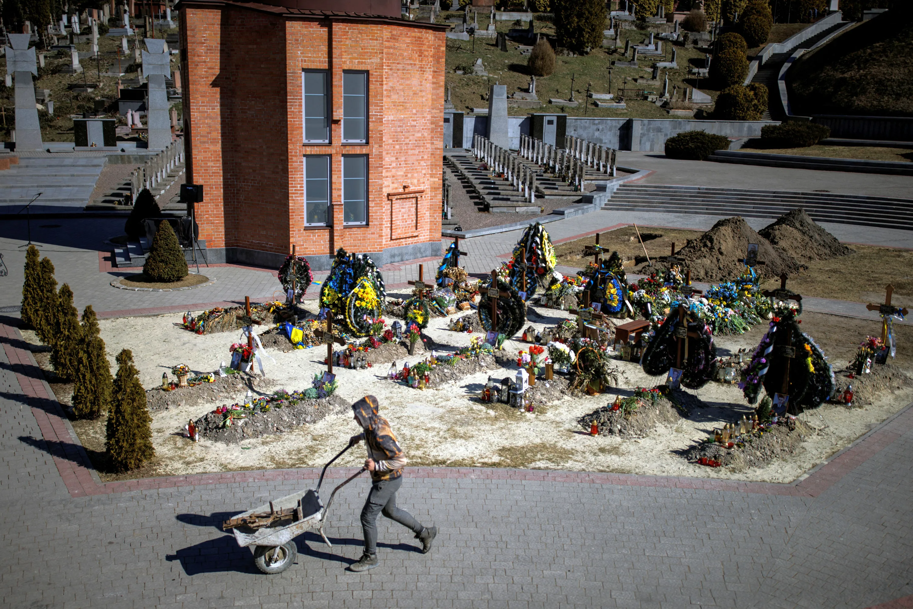 A worker pushes a cart past graves of Ukrainian soldiers who were killed in battle during Russia’s attack on Ukraine, at the Lychakiv cemetery in Lviv, Ukraine, March 28, 2022. (Photo by Alkis Konstantinidis/Reuters)