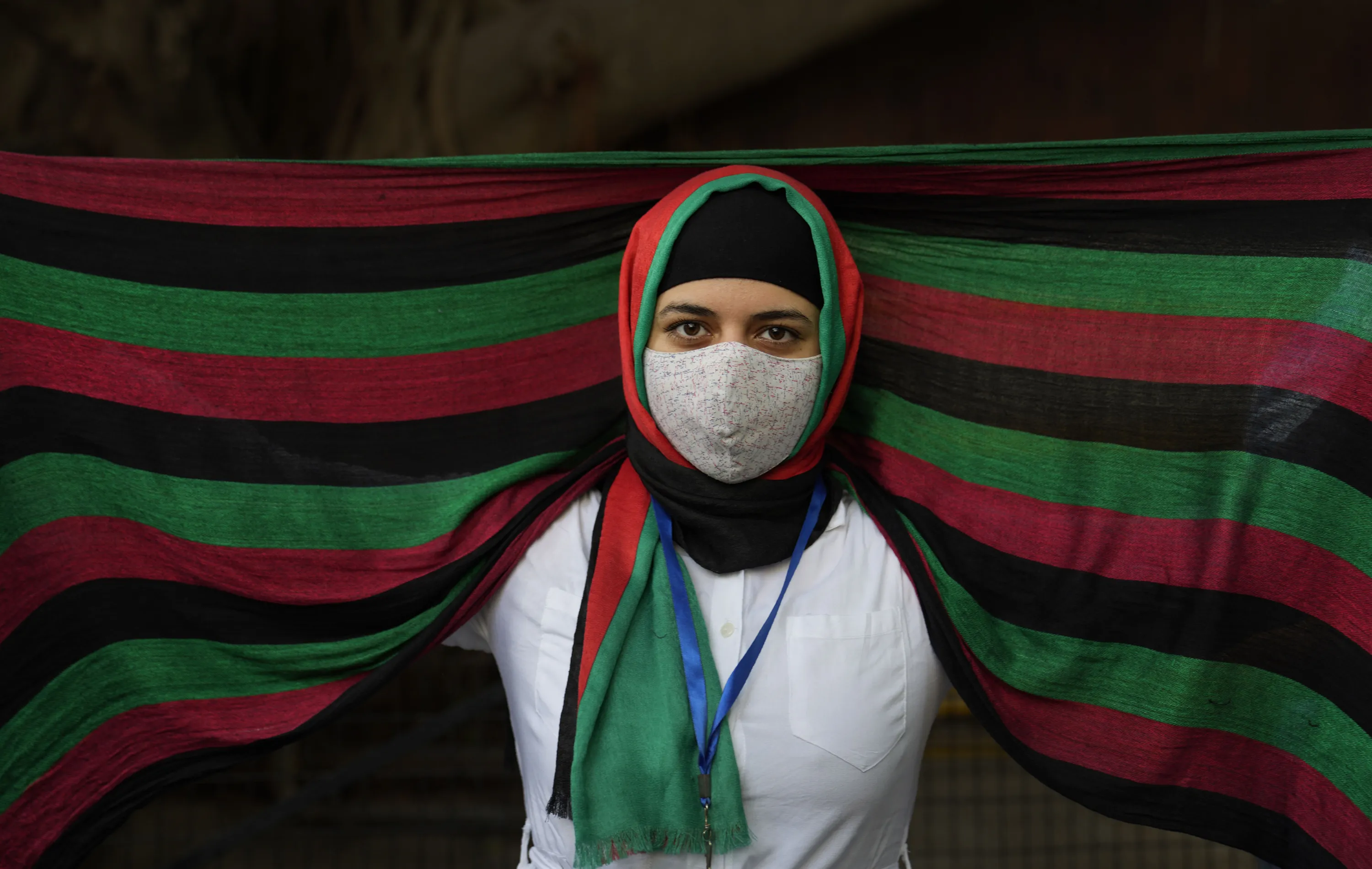 An Afghan refugee wearing a scarf in the colours of the national flag of Afghanistan participates in a protest outside the UNHCR office (United Nation High Commissioner for Refugees) in New Delhi, India, Monday, August 23, 2021. Hundreds of Afghans living in India gathered to protest against the Taliban takeover of Afghanistan and also demanded to be given refugee status in India. (Photo by Manish Swarup/AP Photo)