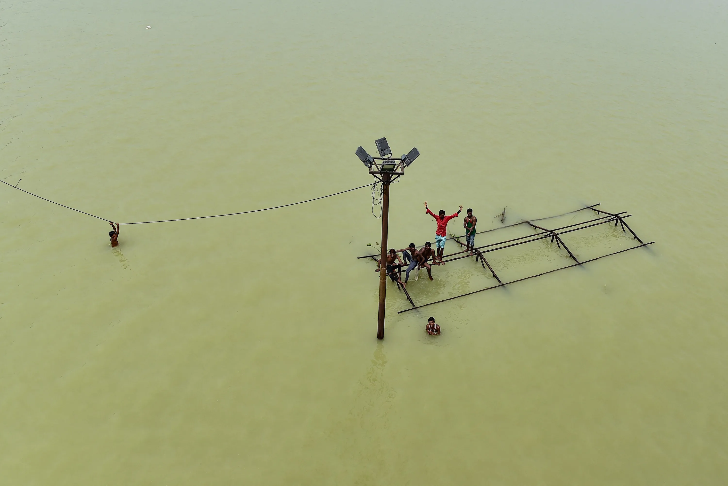 Boys along with local boatmen play atop a submerged structure at Daraganj Ghat, one of the flooded banks of the Ganges River in Allahabad on August 8, 2021. (Photo by Sanjay Kanojia/AFP Photo)