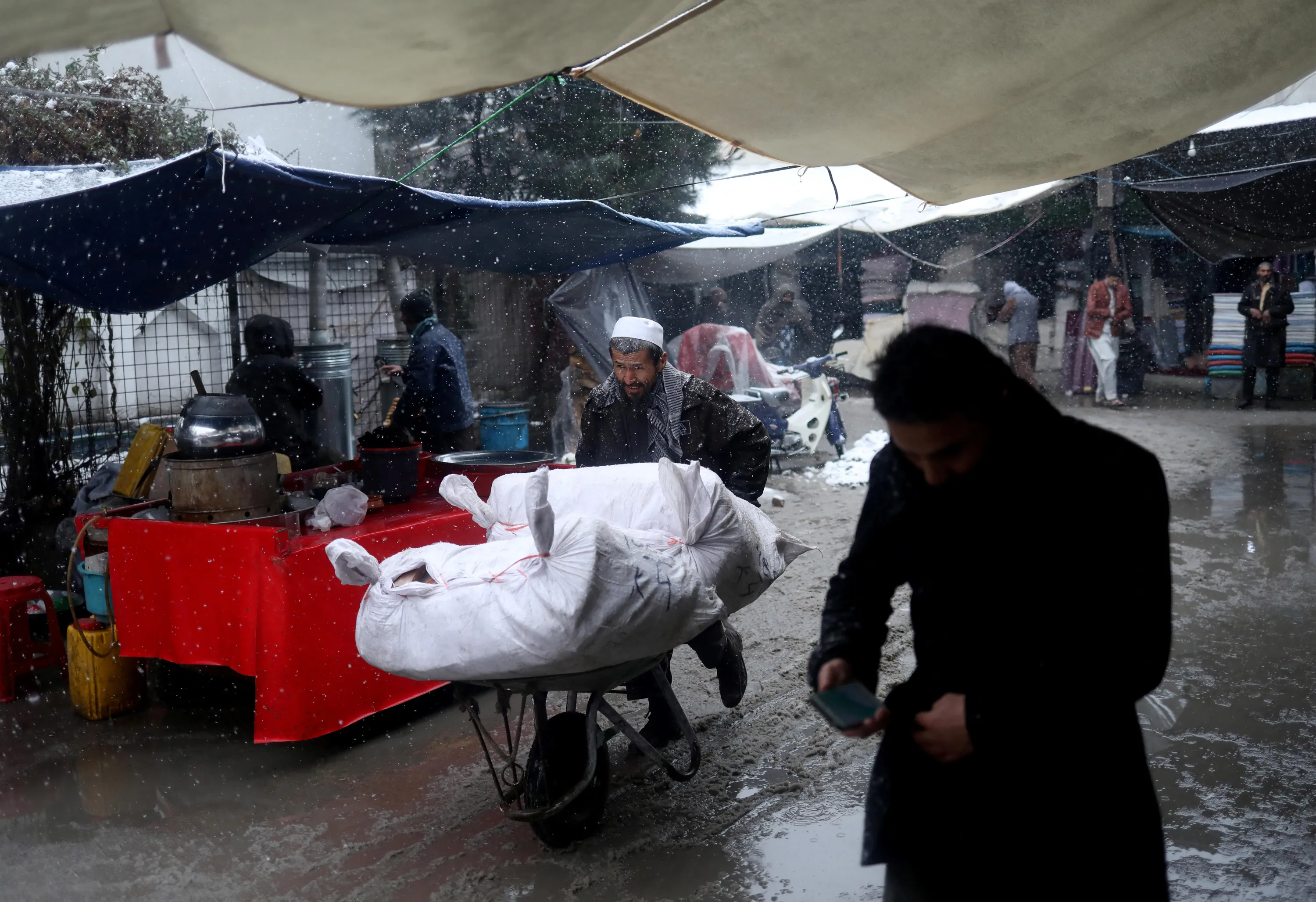 An Afghan man pushes his wheelbarrow in a market during a snowfall in Kabul, Afghanistan, January 3, 2022. (Photo by Ali Khara/Reuters)