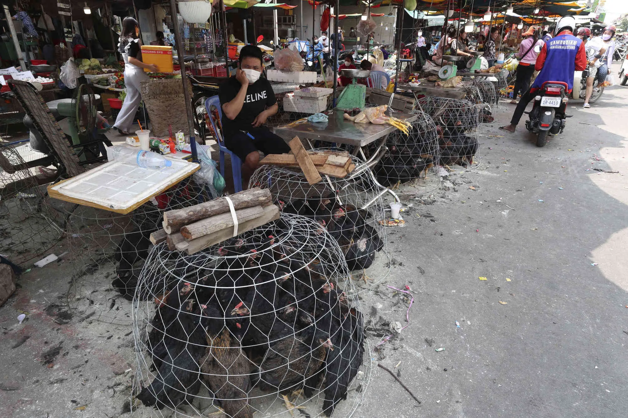 A local vendor talks on a mobile phone as he sells live chickens ahead of the Chinese Lunar New Year celebration in Phnom Penh, Cambodia, Sunday, January 30, 2022. (Photo by Heng Sinith/AP Photo)
