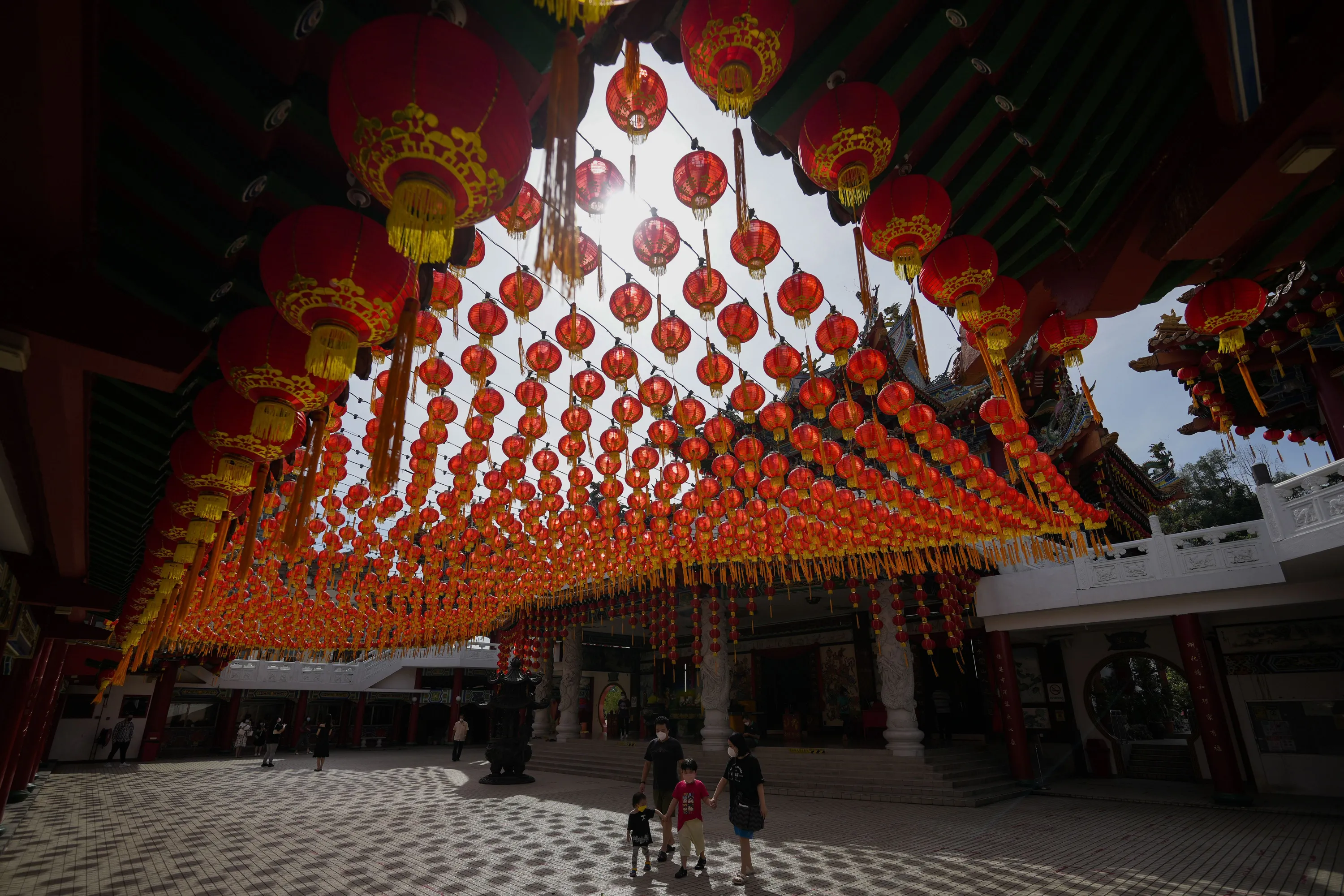 Tourists wearing face masks to help curb the spread of the coronavirus walk under traditional Chinese lanterns on display ahead of the Lunar New Year celebrations at a temple in Kuala Lumpur, Malaysia, Monday, January 10, 2022. Chinese around the world will be celebrating the start of the Year of Tiger on Feb. 1 in the Chinese lunar calendar. (Photo by Vincent Thian/AP Photo)