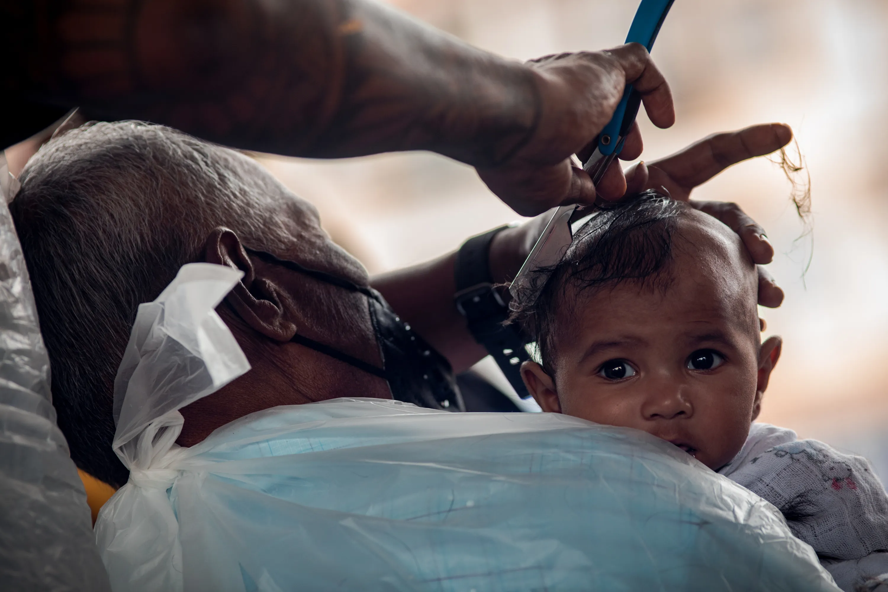 A barber shaves the hair of a Hindu baby to complete one of the religious rituals during the Thaipusam celebration in Selangor, Malaysia on January 18, 2022. The National Security Council has allowed the celebration to be held in strict adherence to the Standard Operation Procedure (SOP) to curb Covid-19 infection and there are some other rituals such as carrying “kavadi” and drum performances are not allowed. (Photo by Syaiful Redzuan/Anadolu Agency via Getty Images)