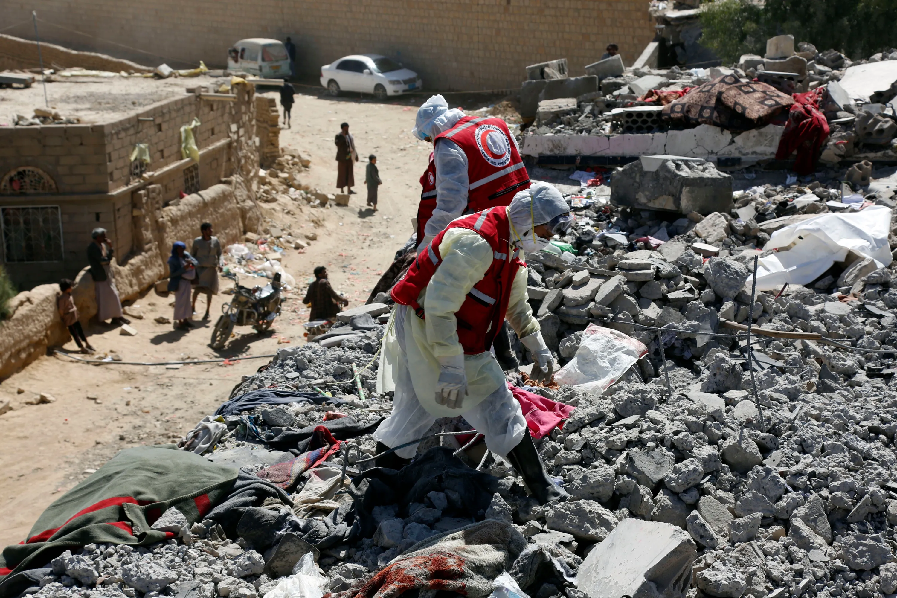 Rescue members search for victims among rubble from over victims struck by aerial attacks carried out by jet crafts of the coalition led by Saudi Arabia targeting a prison in the Houthi strong-hold Saadah Province, on January 22, 2022 in Saadah, Yemen. Aerial attacks carried out by jet crafts of the coalition led by Saudi Arabia targeted a prison leaving at least 90 prisoners killed and over 100 others injured. (Photo by Mohammed Hamoud/Getty Images)