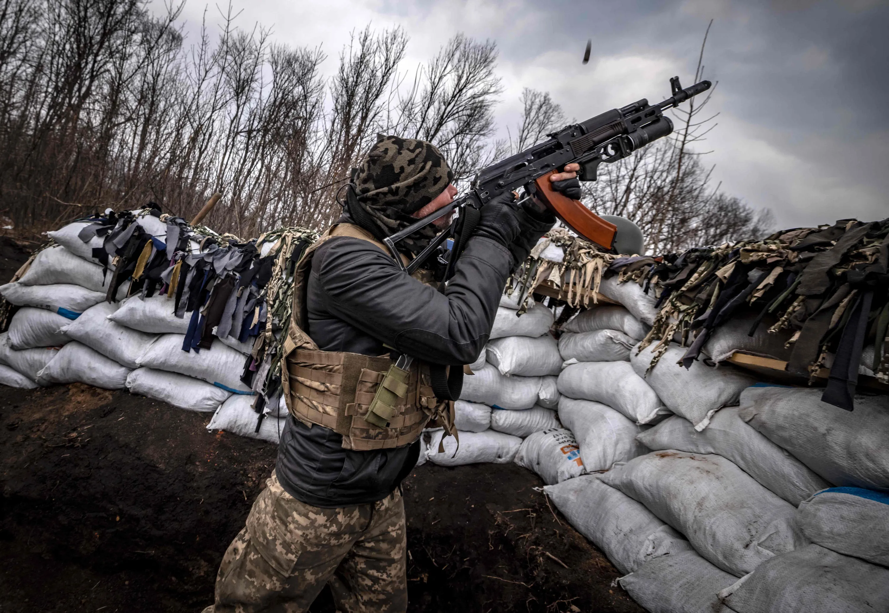 A Ukrainian serviceman shoots with an assault rifle from a trench at the front line east of Kharkiv on March 31, 2022. Russian forces are repositioning in Ukraine to strengthen their offensive on the Donbass, Nato said on March 31, 2022, on the 36th day of the Russian-Ukrainian conflict, as shelling continues in Kharkiv (north) and Mariupol (south). (Photo by Fadel Senna/AFP Photo)