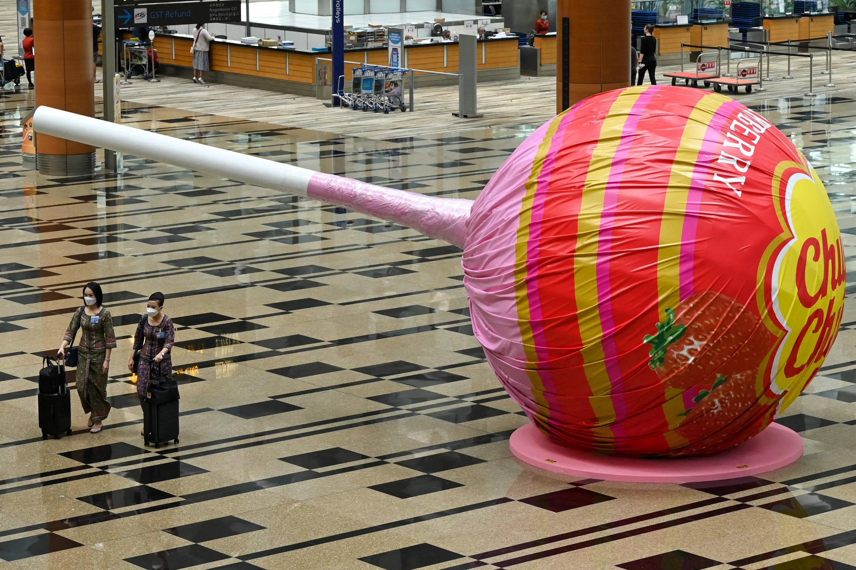 Singapore Airlines stewardesses walk past a giant lollipop candy display at Changi International Airport in Singapore on April 1, 2022, as Singapore reopened its land and air borders to travellers fully vaccinated against the Covid-19 coronavirus. (Photo by Roslan Rahman/AFP Photo)