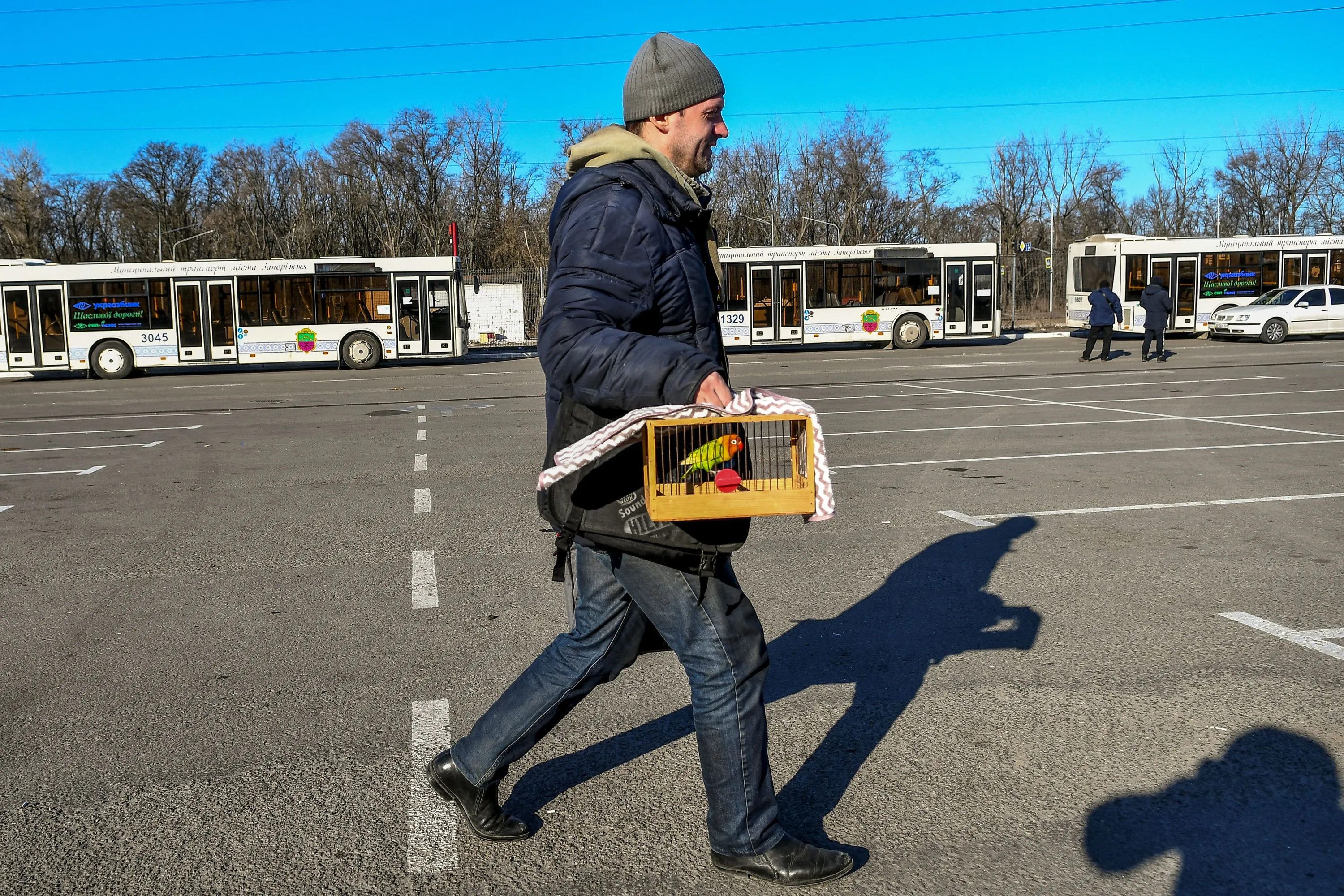 A man carries a bird after fleeing Mariupol amid Russia's ongoing attack on Ukraine, in Zaporizhzhia, Ukraine on March 19, 2022. (Photo by Reuters/Stringer)