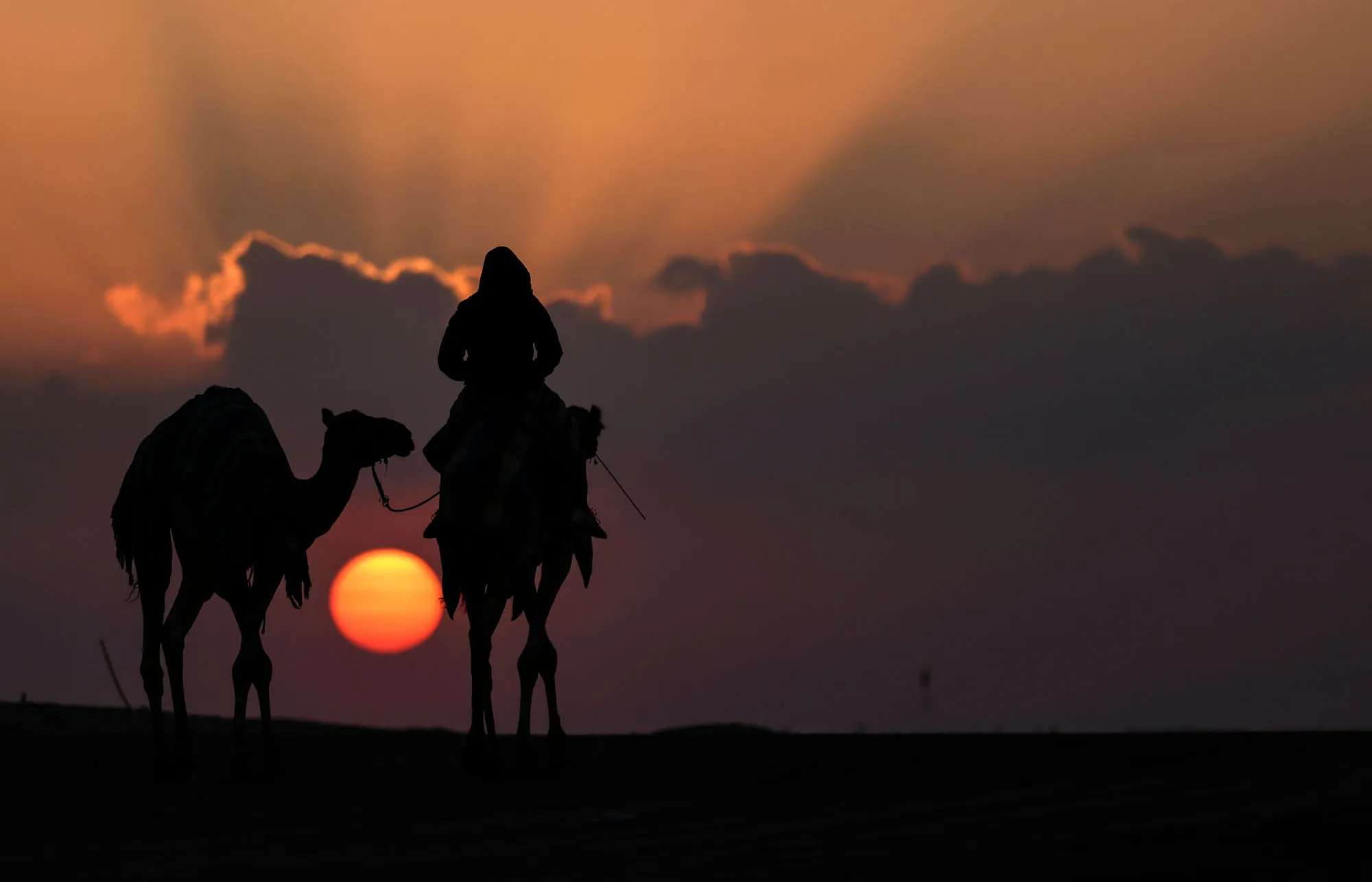 Emirati men walk their camels at sunrise during the Mazayin Dhafra Camel Festival in the desert near the city of Madinat Zayed, some 150 kms west of the capital Abu Dhabi, on January 23, 2022. The festival, which attracts participants from around the Gulf region, includes a camel beauty contest, a display of UAE handcrafts and other activities aimed at promoting the country's folklore. (Photo by Karim Sahib/AFP Photo)
