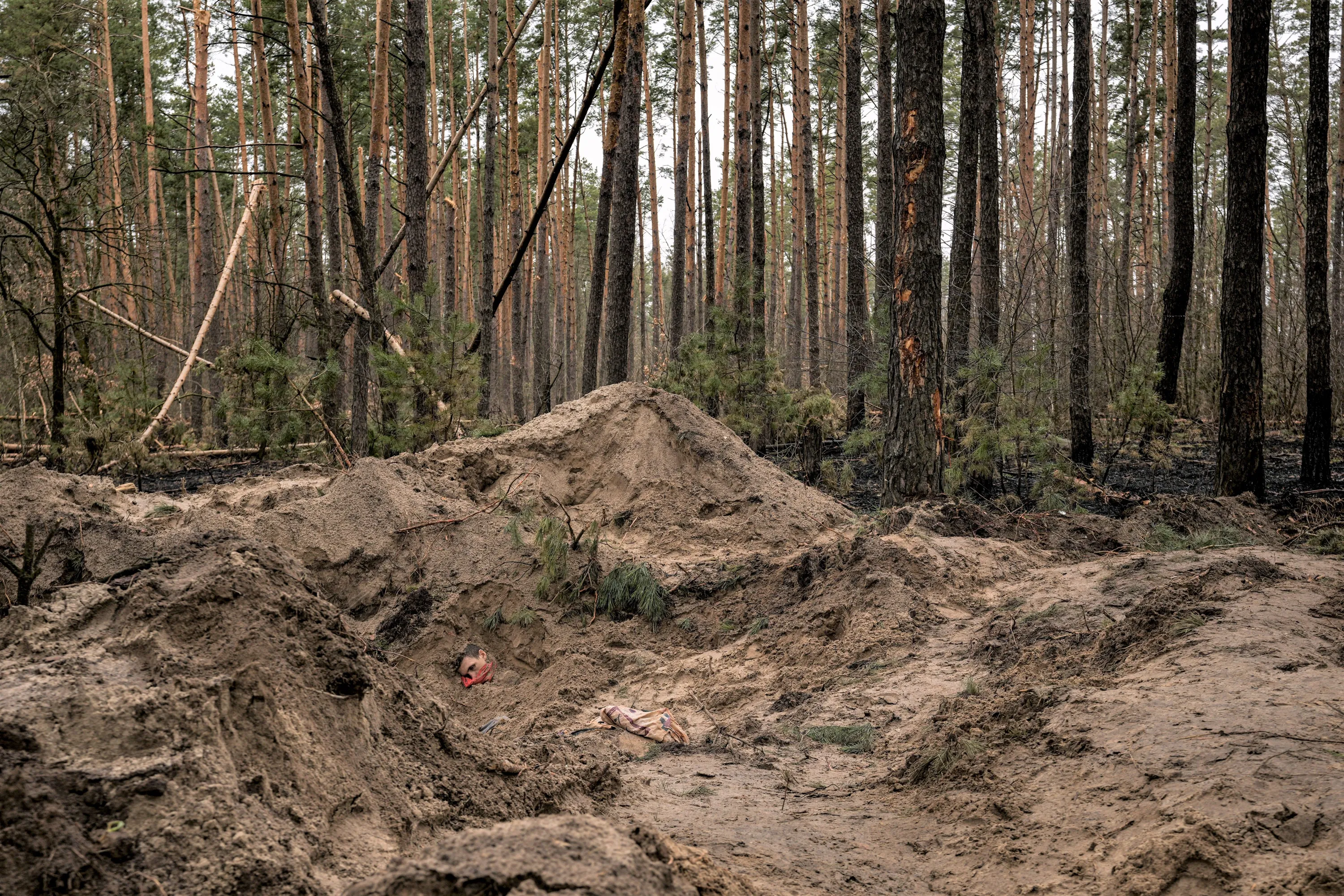 The bodies of village mayor Olga Sukhenko, her husband and son and that of a man believed to be a Ukrainian serviceman, who was not yet identified, lie in pit in the village of Motyzhyn, Ukraine, Sunday, April 3, 2022. The pit is situated behind a plot of land with three houses where Russian forces had slept and were entrenched. (Photo by Vadim Ghirda/AP Photo)