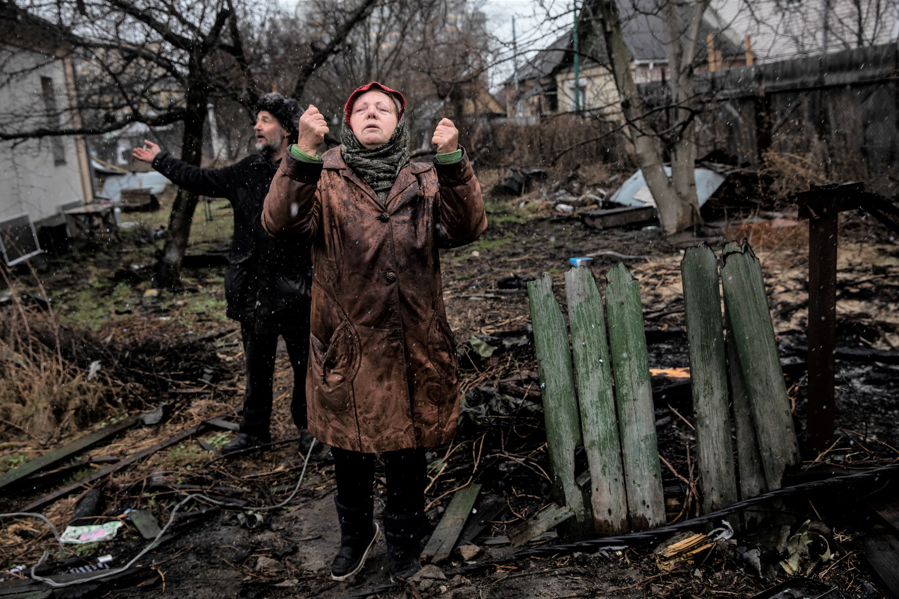 Larisa Savenko 72, stands outside her damaged home with Andriy Leshbon in war torn Bucha, Ukraine where destroyed Russian tanks, armored vehicles and other equipment litter the road where she lives on April 3,2022.She has stayed in her home since the Russians arrived to her neighborhood on February 27th. “A Russian APC was parked at my garden for 3 days (from march 5 to 7). Five gunmen entered my house, they looked at our documents and took our phones away. The Russian told us that we are lucky to have them, because other Russian troops would have already shot them. The Russians kicked out my neighbors out of their home at night, and lived in their house. We had to stay in our stable for a couple of nights with 3 dogs, 5 cats and 3 people. We were not allowed to start a fire to heat ourselves. The gunfire did not stop for a moment”. (Photo by Heidi Levine/The Washington Post)