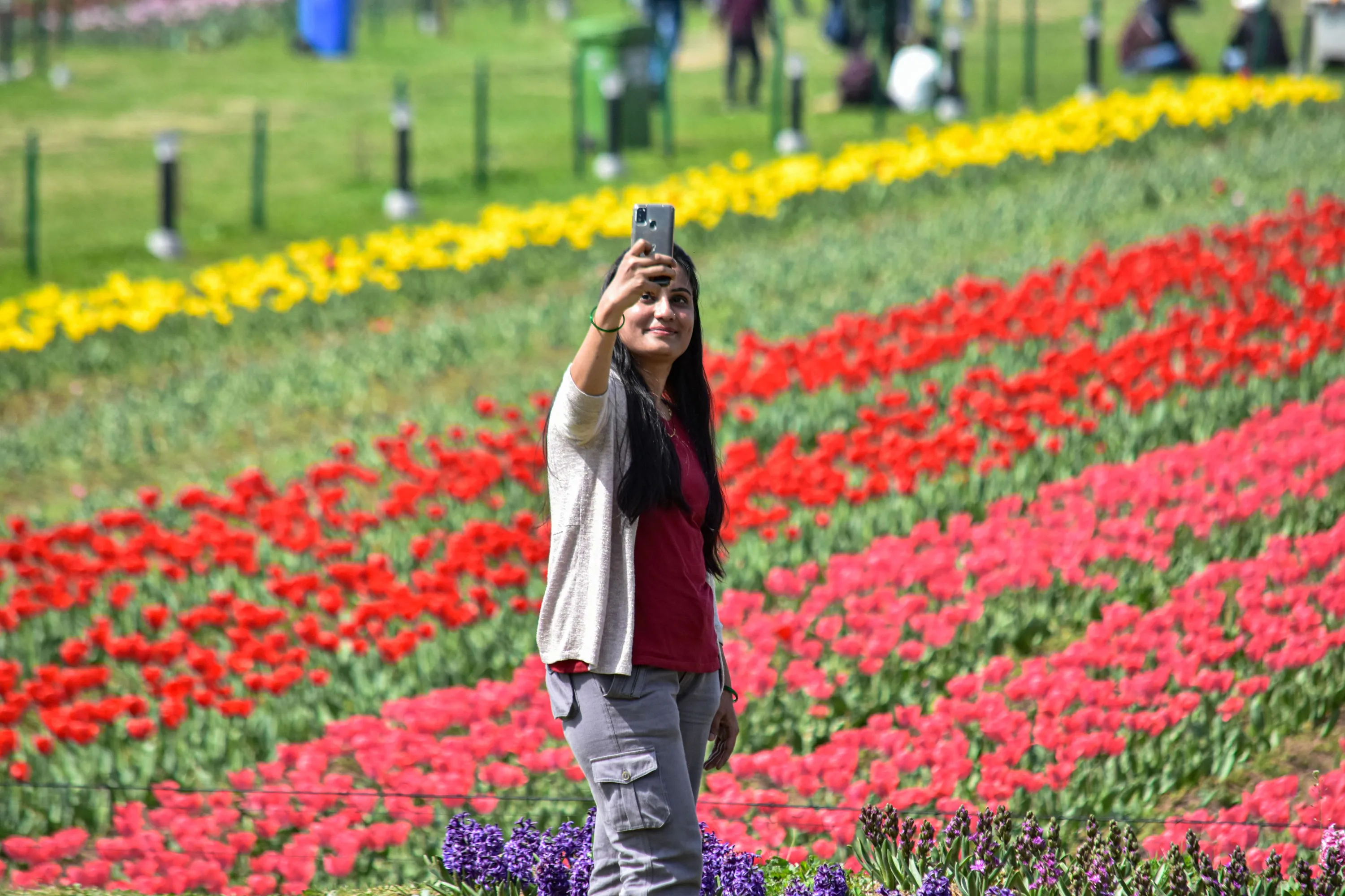 An Indian tourist girl takes a selfie at Asia's largest tulip garden in Srinagar on March 23, 2022. Asia's largest tulip garden, housing 1.5 million tulips of 68 varieties, opened to the public today in Srinagar. As Kashmir witnesses a massive rush of visitors this year amid easing Covid-19 restrictions, the tulip garden has been one of the major attractions vital to boosting tourism this season. (Photo by Saqib Majeed/SOPA Images/Rex Features/Shutterstock)