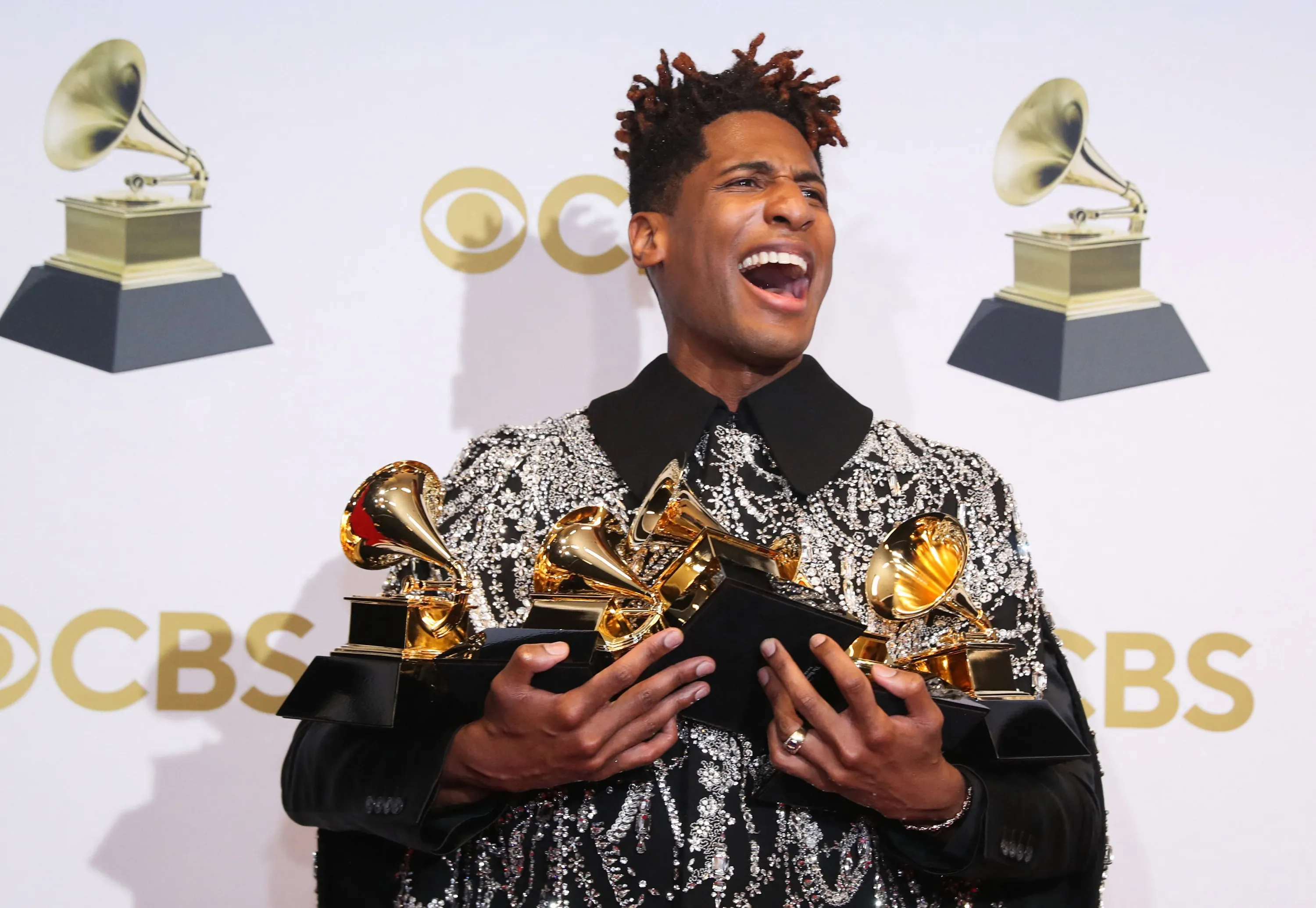 American singer Jon Batiste winner of best American roots performance, best American roots song, best music video and best score soundtrack for visual media poses in the winners photo room during the 64th Annual GRAMMY Awards at MGM Grand Garden Arena on April 03, 2022 in Las Vegas, Nevada. (Photo by Steve Marcus/Reuters)
