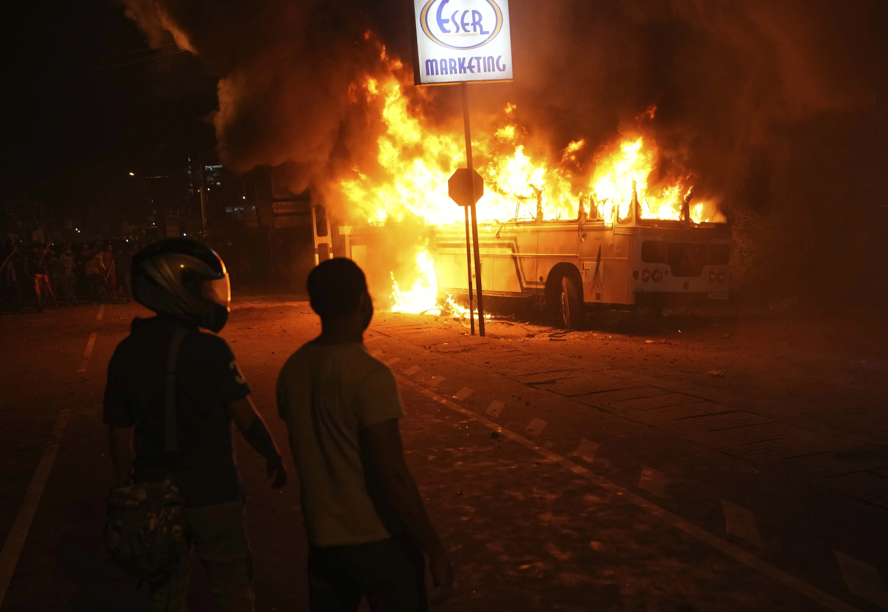 Sri Lankans watch after setting a bus on fire during a protest outside Sri Lankan president's private residence on the outskirts of Colombo, Sri Lanka, Friday, April 1, 2022. (Photo by Eranga Jayawardena/AP Photo)