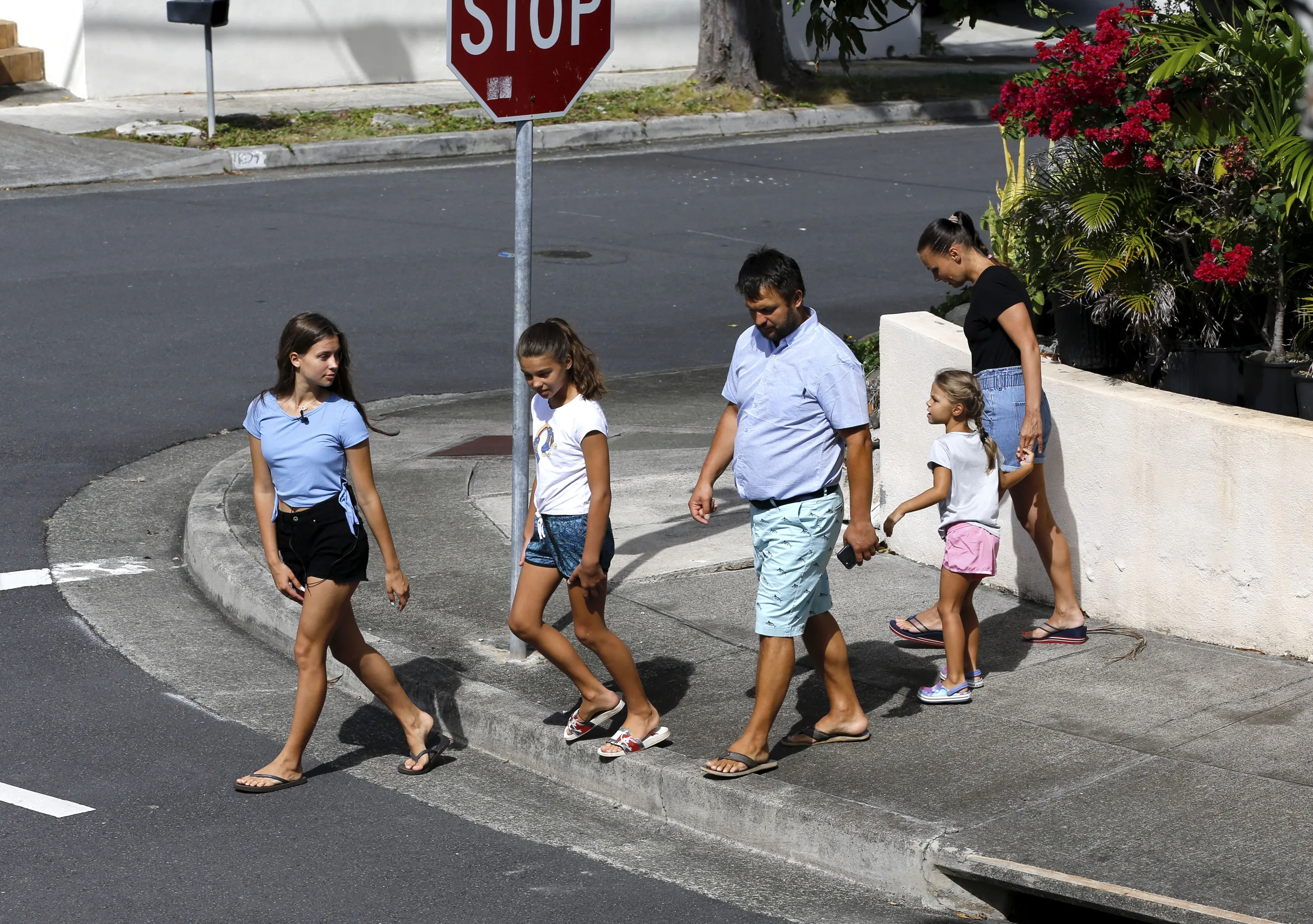 Vasyl Prishchak, center, of Kyiv, Ukraine, walks with his wife, Marina, right, and daughters, Ksenia, 5, second from right, Sofiia, 10, second from left, and Mariia, 16, left, in Kailua, Hawaii, Wednesday, March 23, 2022. The Prishchak family travelled to Hawaii for a long-awaited vacation on Feb. 16 and planned to return to Ukraine on March 7. But a week into their vacation, Russia invaded their country, leaving the family in shocked disbelief with no access to family, friends, money or their home. (Photo by Caleb Jones/AP Photo)