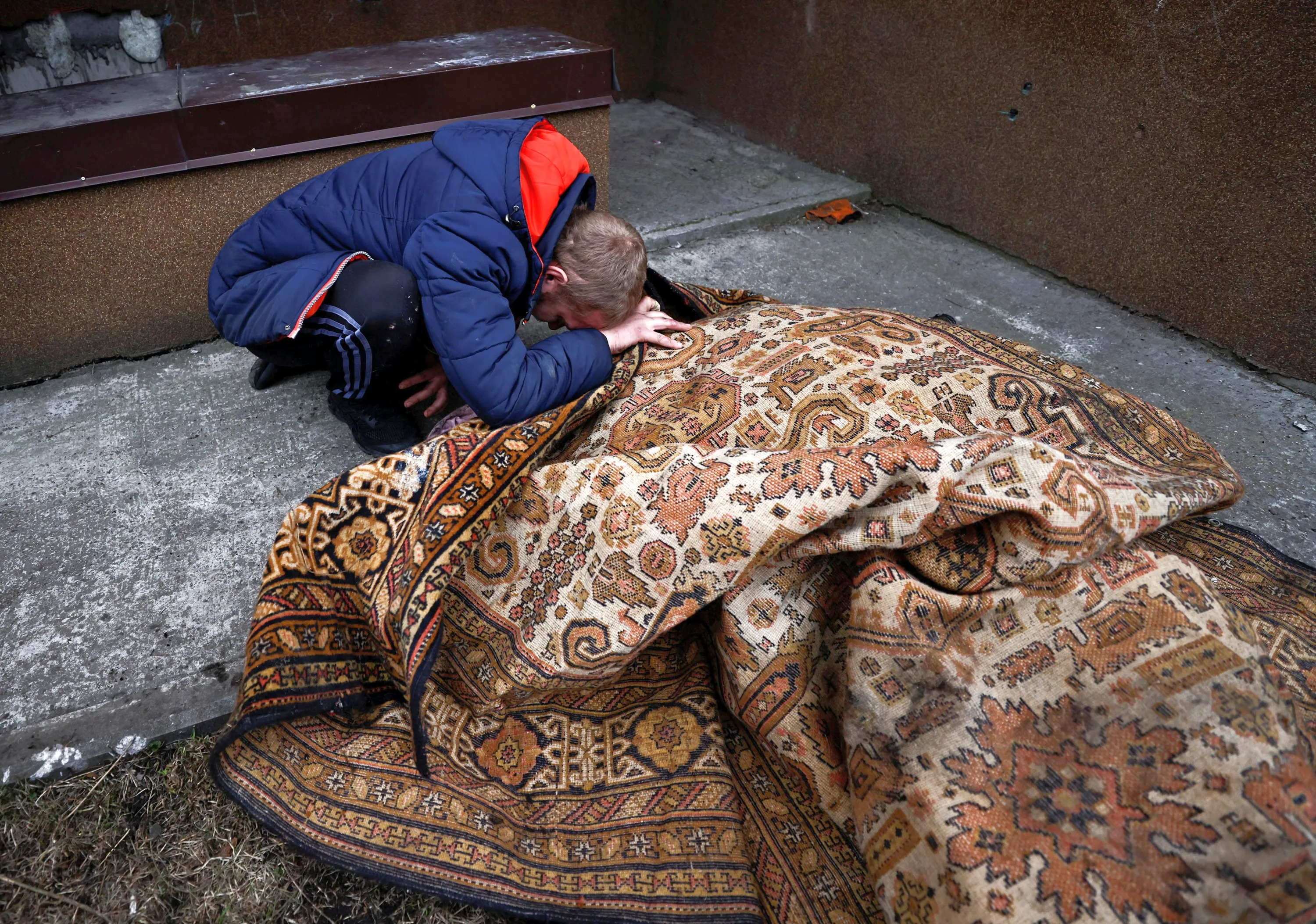 Serhii Lahovskyi, 26, mourns by the body of his friend Ihor Lytvynenko, who according to residents was killed by Russian Soldiers, after they found him beside a building's basement, amid Russia's invasion of Ukraine, in Bucha, Ukraine on April 5, 2022. (Photo by Zohra Bensemra/Reuters)