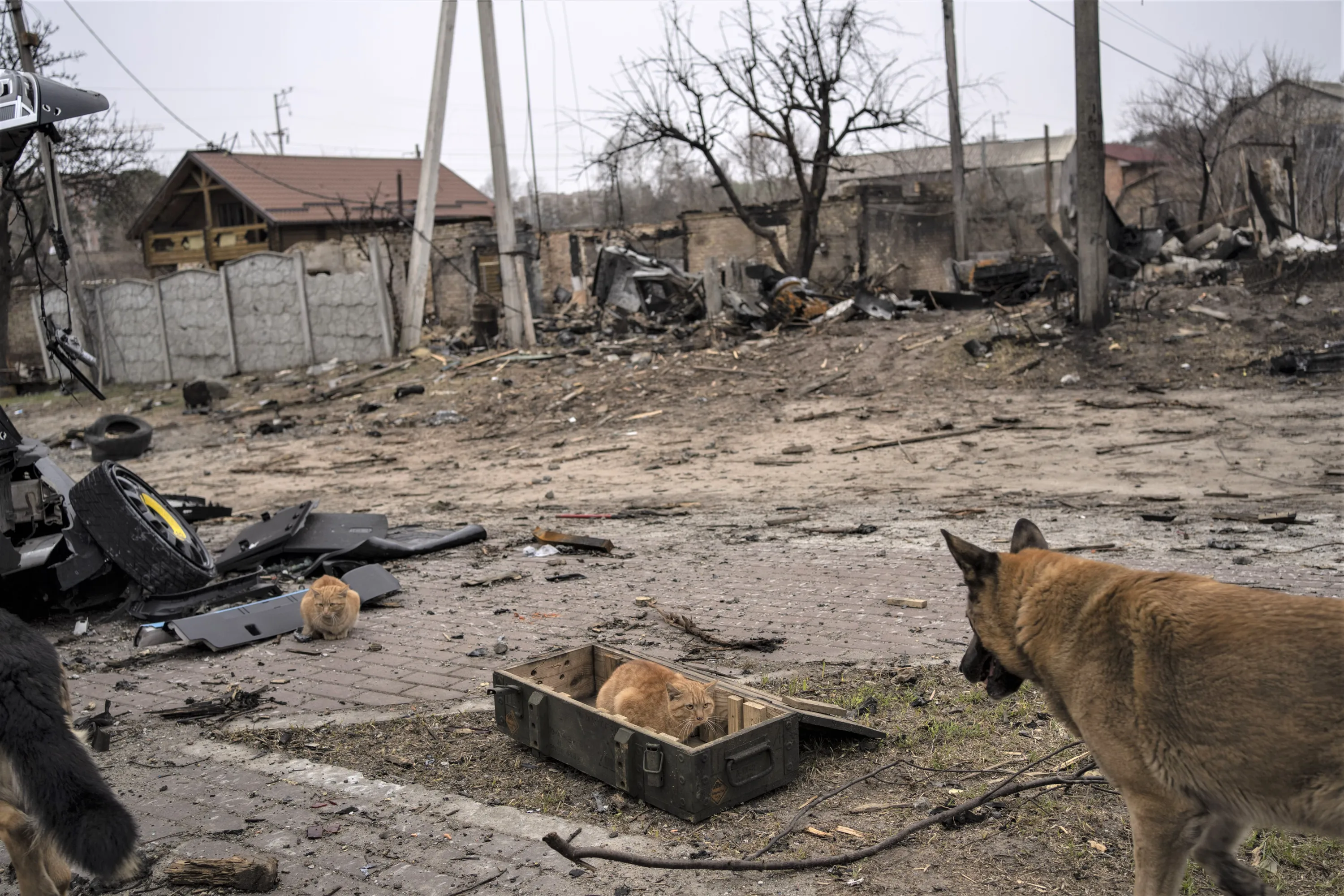 A cat sits in a box where ammunitions are kept, in Bucha, on the outskirts of Kyiv, Ukraine, Tuesday, April 5, 2022. (Photo by Rodrigo Abd/AP Photo)