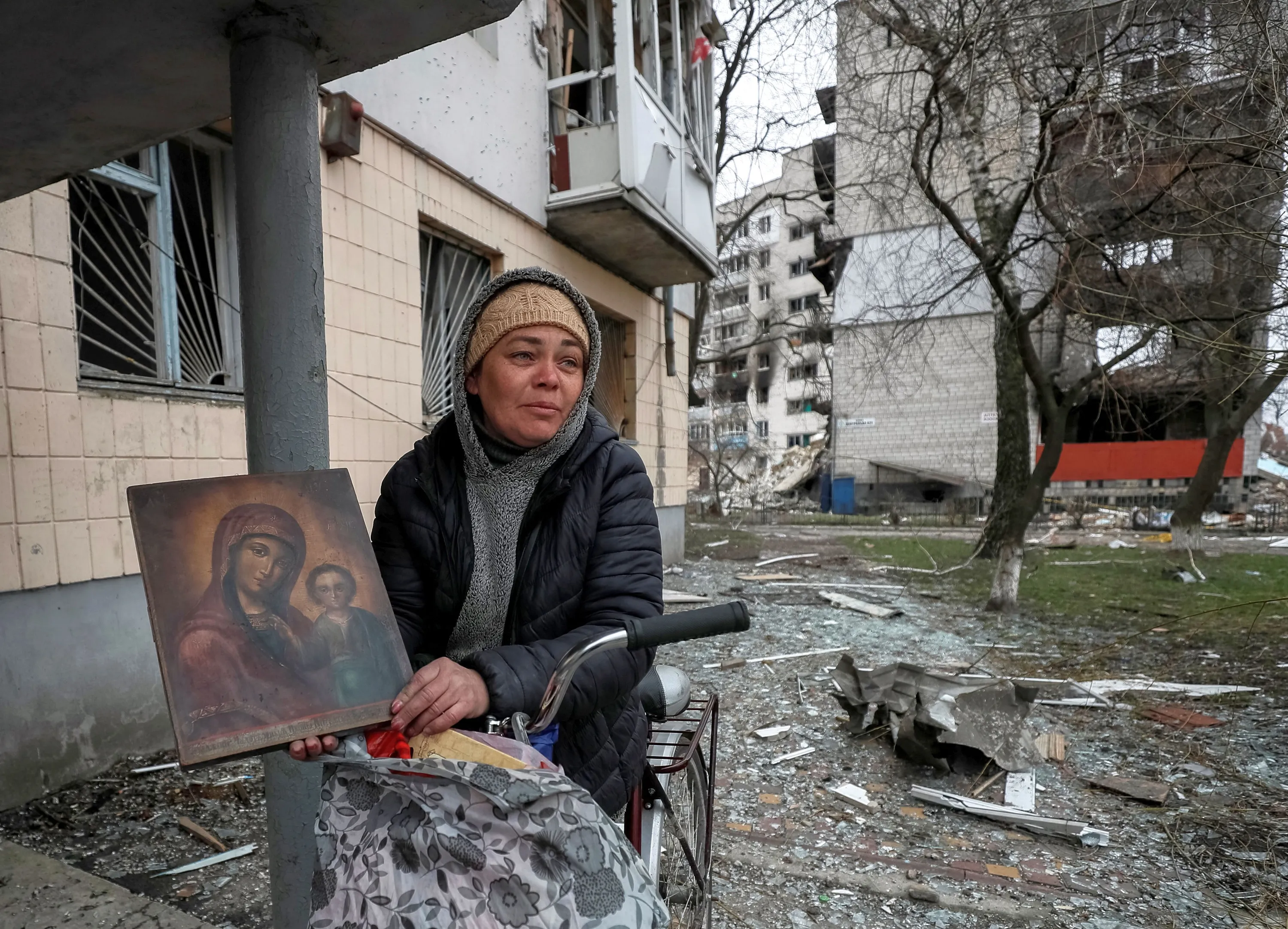 Local resident Olga holds an icon, which she takes away from her destroyed apartment in Borodyanka, amid Russia's invasion of Ukraine, in Kyiv region, Ukraine, April 5, 2022. (Photo by Gleb Garanich/Reuters)