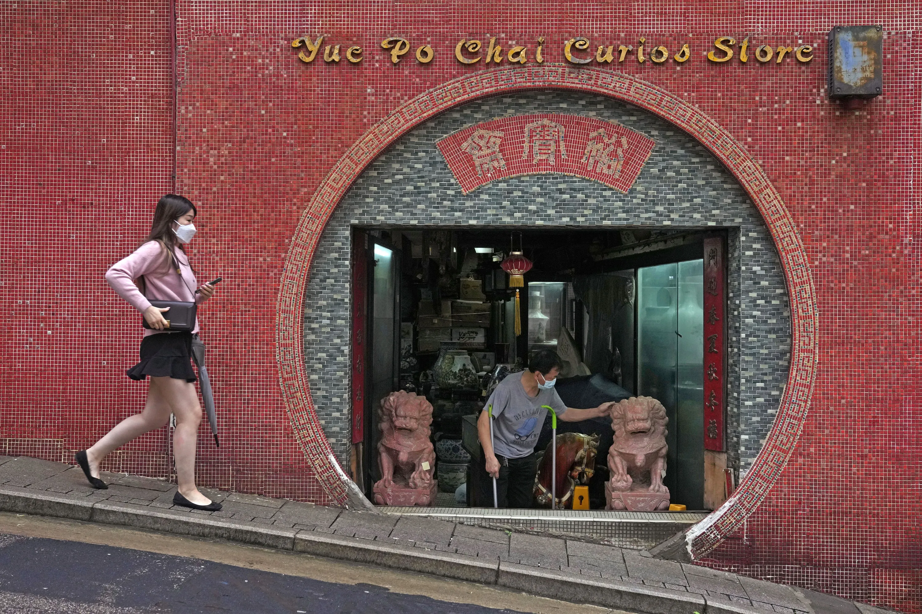 A woman wearing a mask walks past an antique store in Hong Kong, Friday, March 25, 2022. (Photo by Kin Cheung/AP Photo)