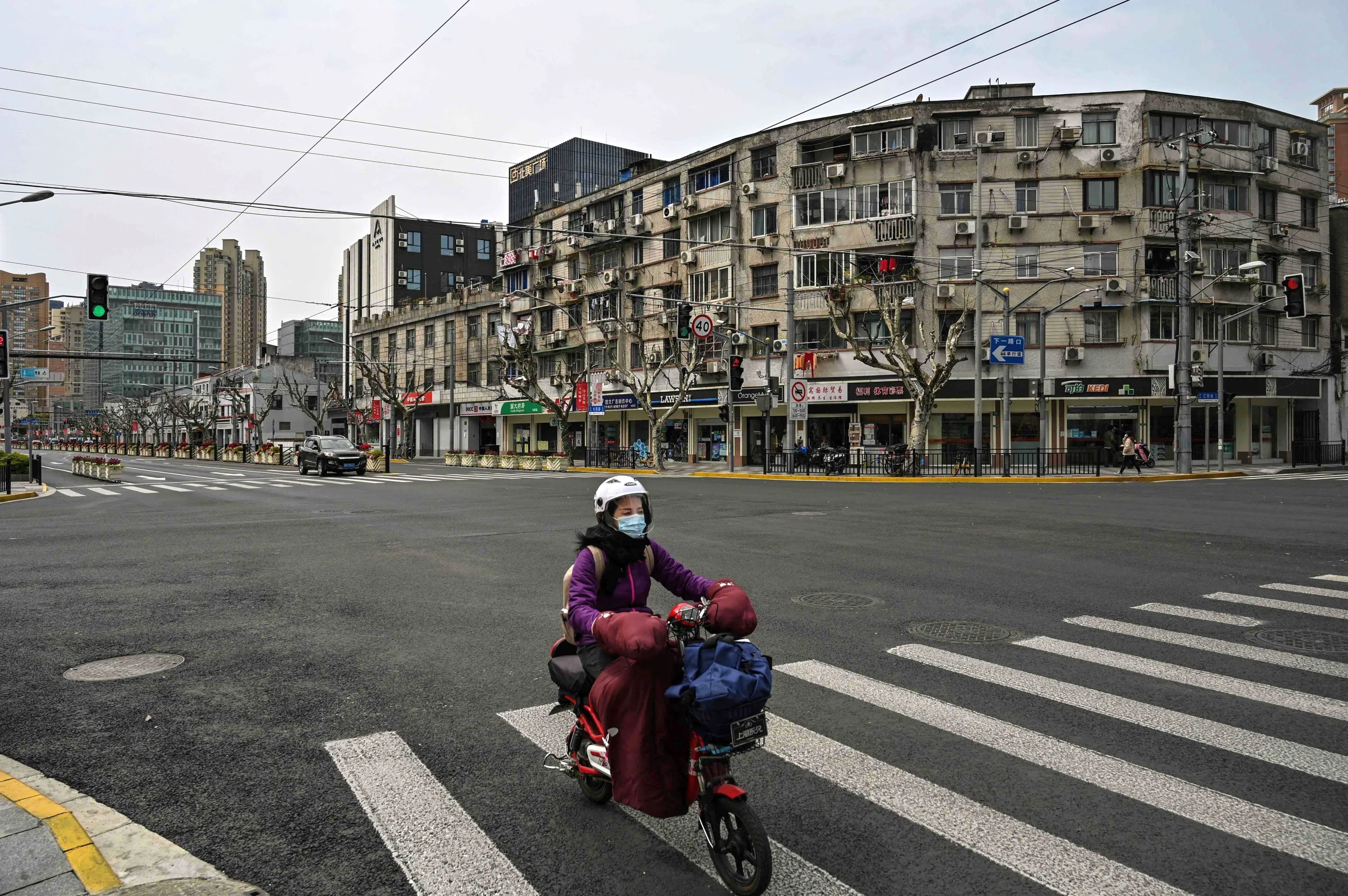 A woman drives a scooter down a quiet street in Yangpu distric, in Shanghai on March 28, 2022. Millions of people in China's financial hub were confined to their homes on March 28 as the eastern half of Shanghai went into lockdown to curb the nation's biggest Covid outbreak. (Photo by Hector Retamal/AFP Photo)