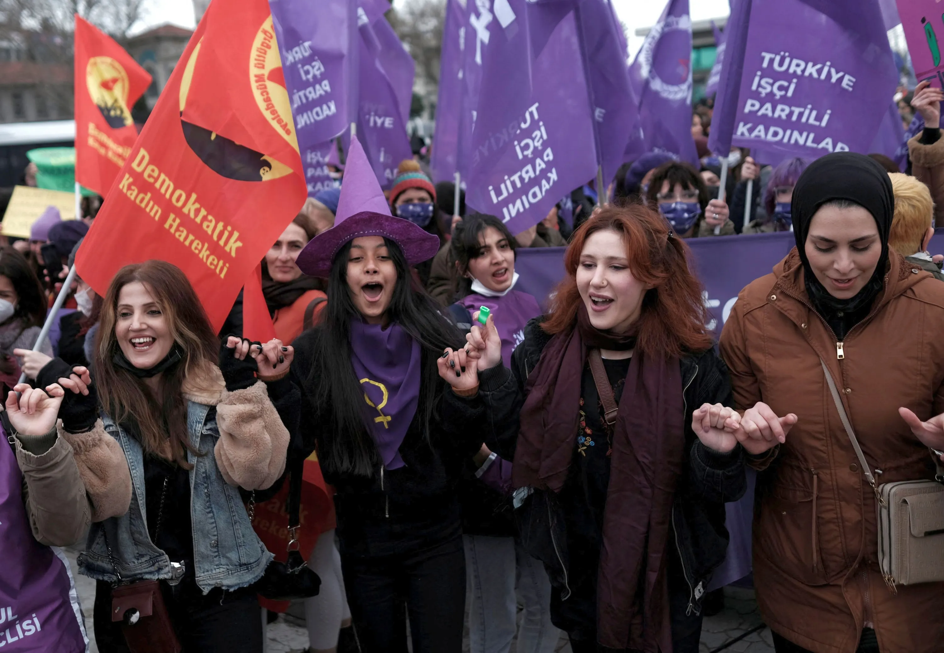 Demonstrators dance during a rally ahead of International Women's Day, in Istanbul, Turkey on March 6, 2022. (Photo by Murad Sezer/Reuters)