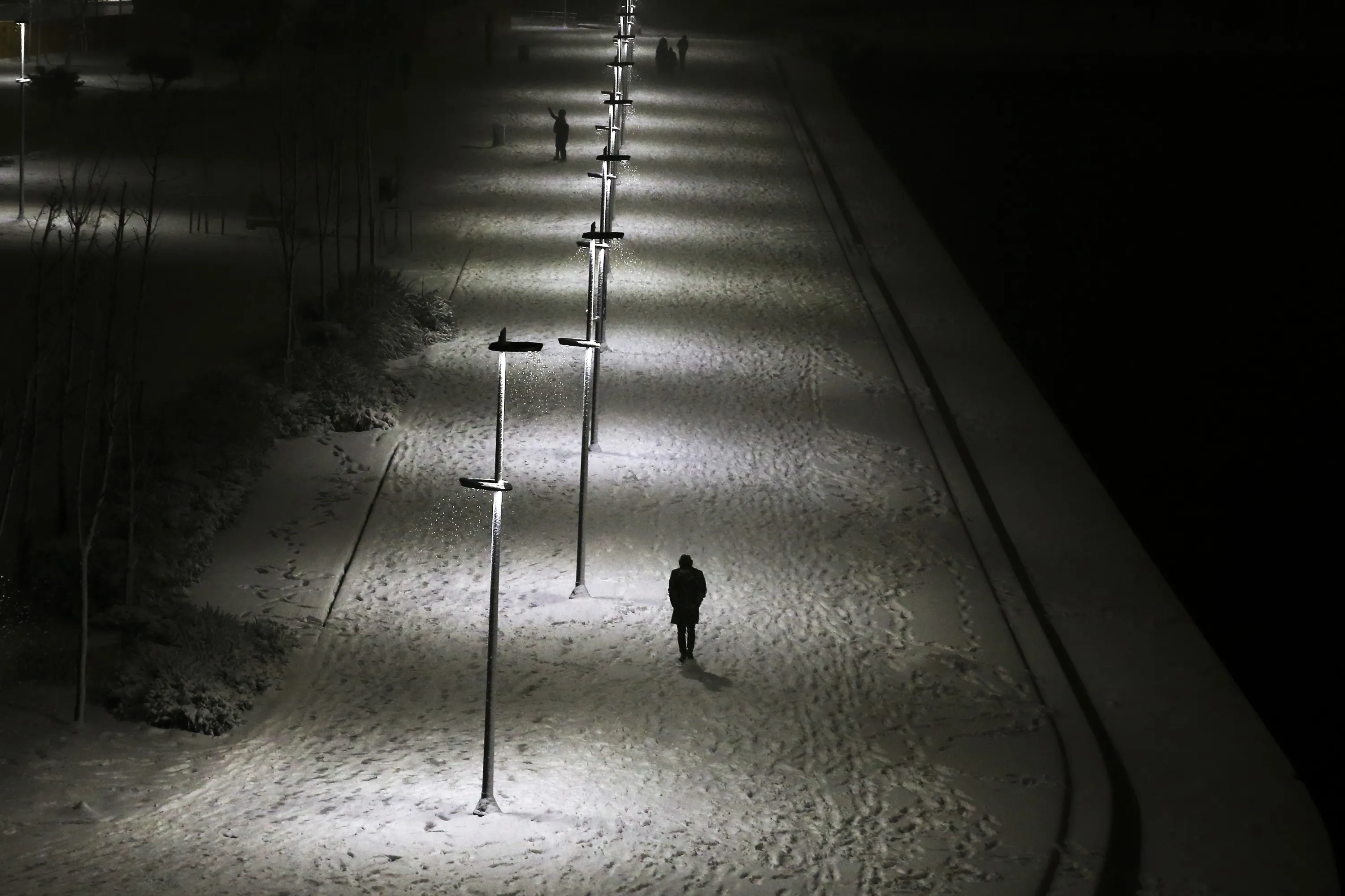 Pedestrians walk along a snow-covered promenade during a snowfall in Istanbul, Turkey, Saturday, March 12, 2022. (Photo by Emrah Gurel/AP Photo)