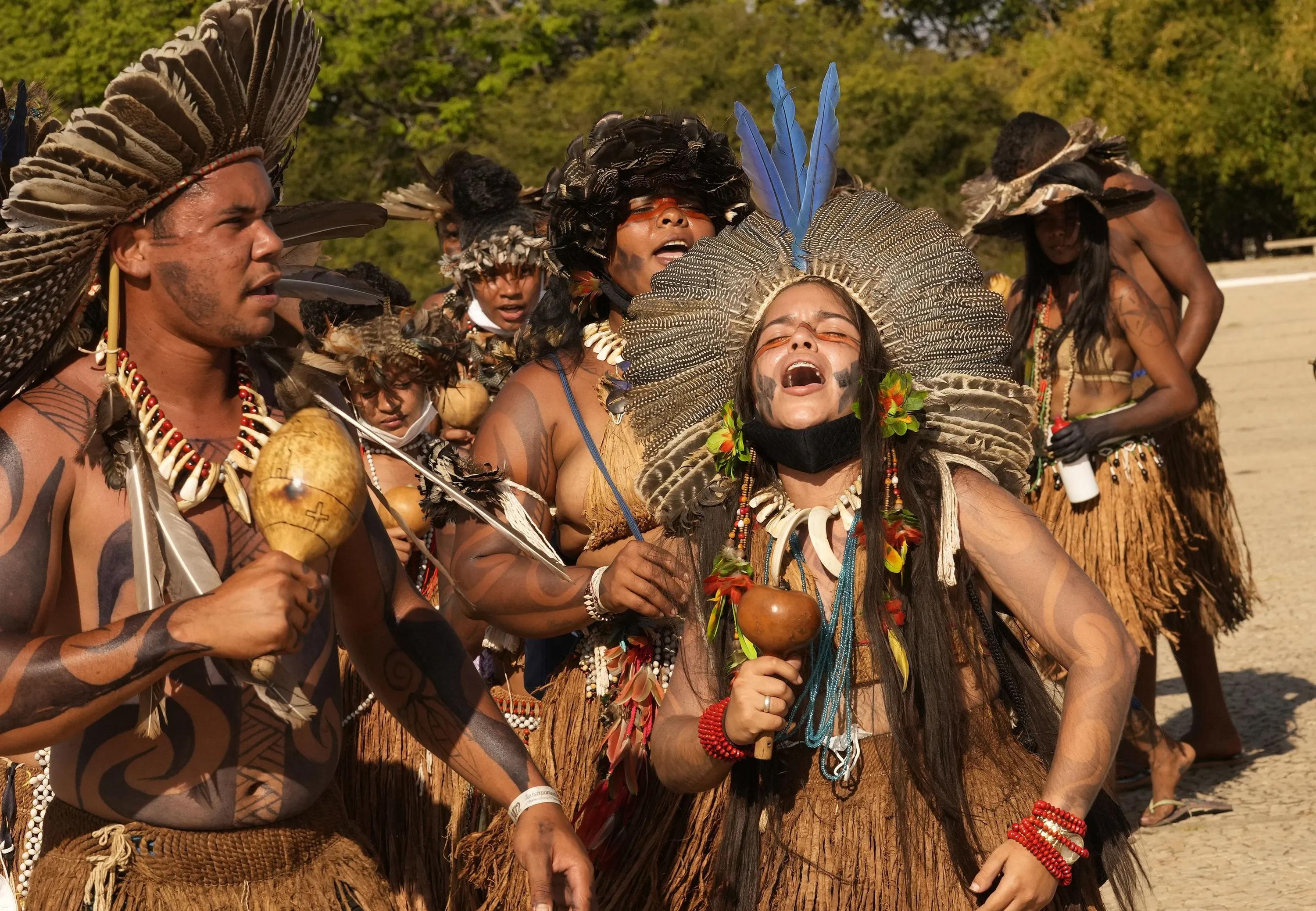 Indigenous people perform a ritual during the “Luta pela Vida”, or Struggle for Life mobilization, a protest to pressure Supreme Court justices who are expected to issue a ruling that will have far-reaching implications for tribal land rights, outside the Supreme Court in Brasilia, Brazil, Wednesday, August 25, 2021. (Photo by Eraldo Peres/AP Photo)