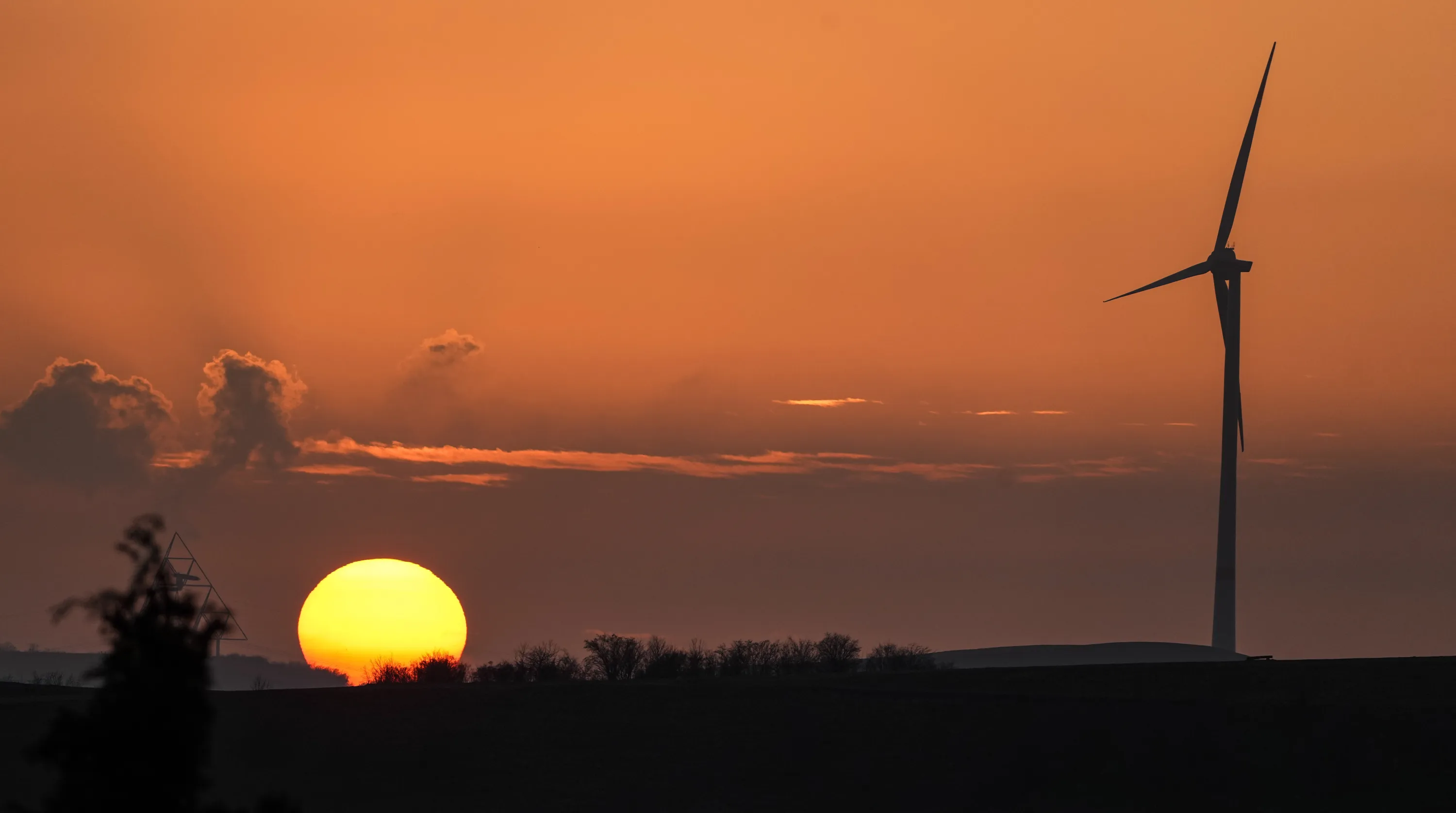 A wind turbine at sunset in Gelsenkirchen, Germany, Monday, January 10, 2022. (Photo by Martin Meissner/AP Photo)