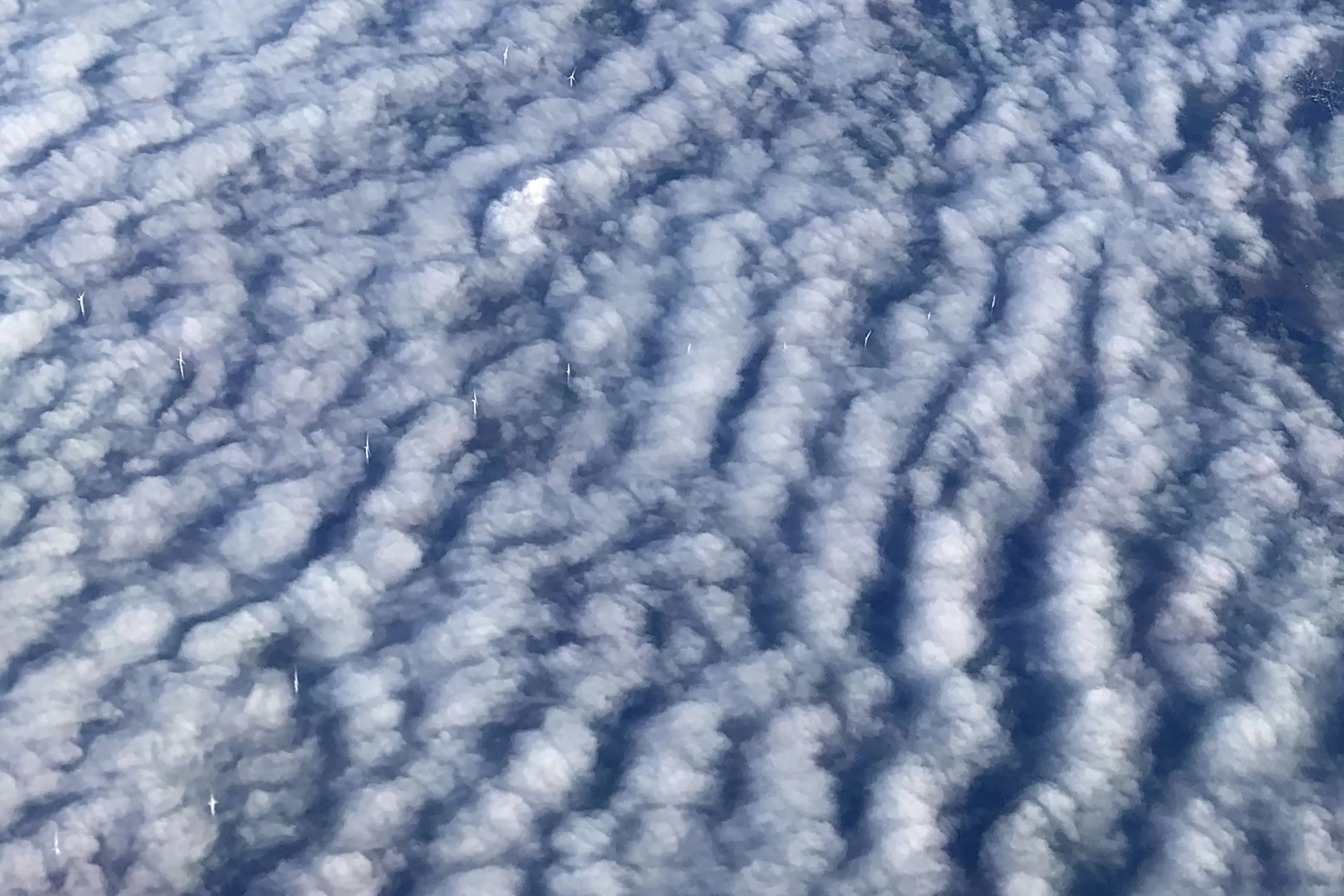 This picture taken from a plane shows wind turbines through stratocumulus clouds over Germany on December 7, 2021. (Photo by Olivier Morin/AFP Photo)