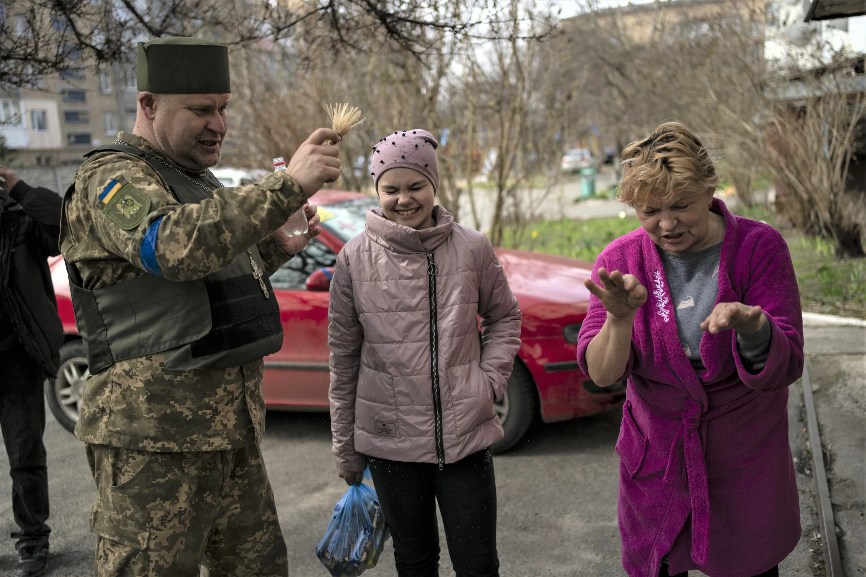 Chaplain Dmitri blesses a group of neighbors in Bucha, in the outskirts of Kyiv, Ukraine, Friday, April 8, 2022. (Photo by Rodrigo Abd/AP Photo)