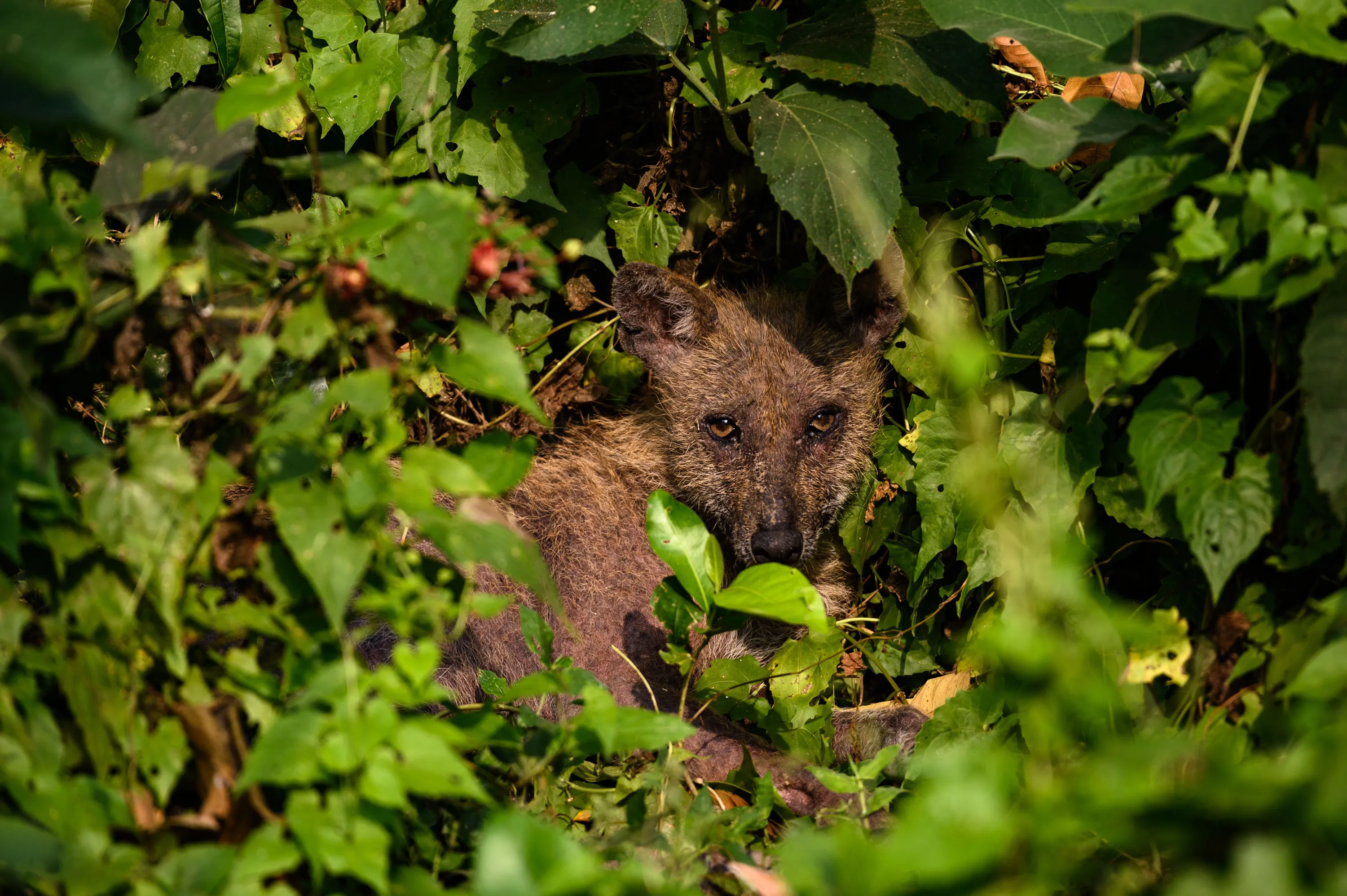 A sick golden jackal (canis aureus) is peeking out from the jungle at Tehatta, West Bengal, India on March 31, 2022. (Photo by Soumyabrata Roy/NurPhoto via Getty Images)