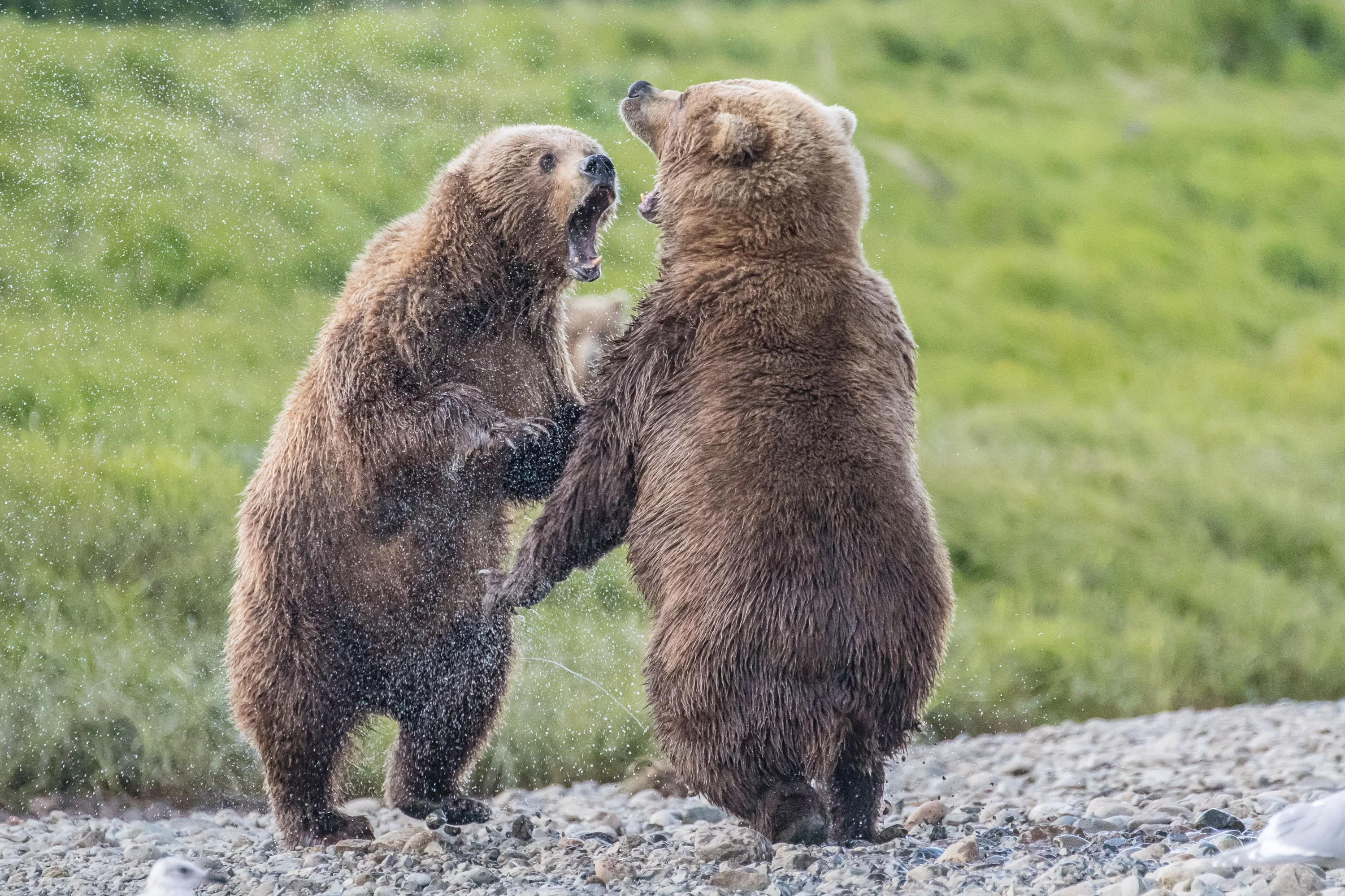 Two huge brown bears fight it out for the best fishing spot on the Mikfik River in Alaska, USA on March 18, 2022. This is the grizzly moment two 50-stone brown bears get into a fight over the top spot to catch salmon from a river. Neither wanted to back down but they eventually came to a compromise and walked away before they were injured in the scuffle. (Photo by Laura Gregory/Animal News Agency)