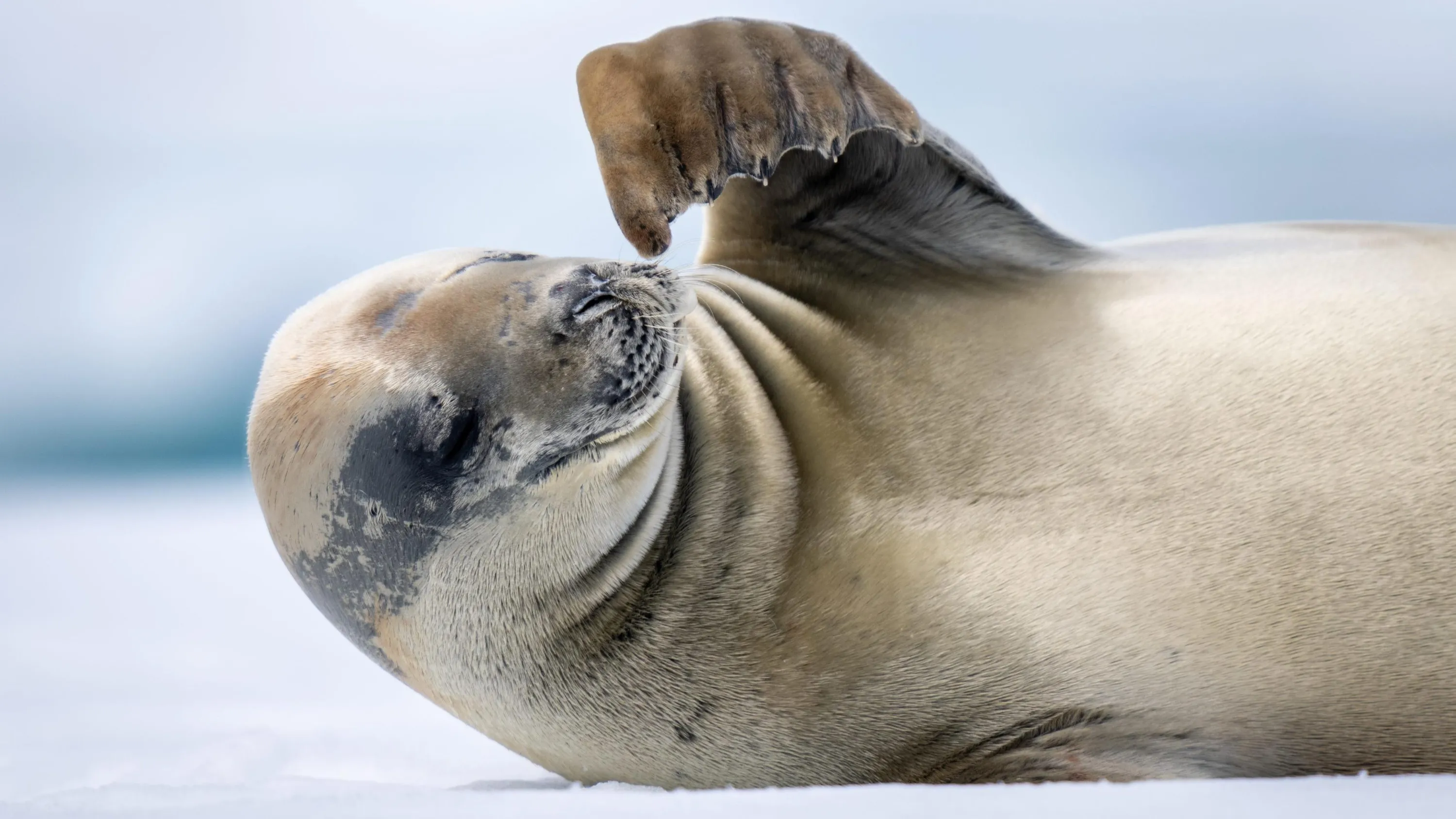 A young crabeater seal reclines on an ice floe, unfazed by a boat sailing past a few feet away in Charlotte Bay, on the west coast of the Antarctic Peninsula end of March 2022. (Photo by Nick Dale/Solent News)