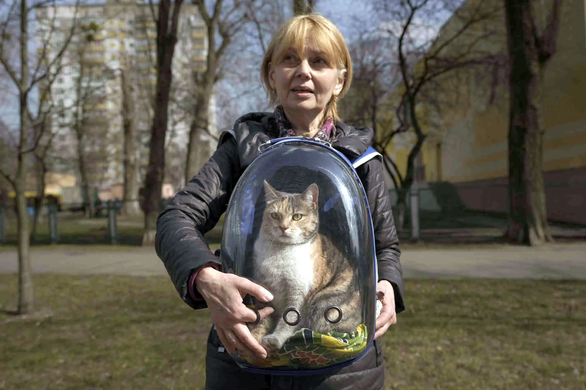 Irina poses with her cat Alitsia, after she went back into the embattled town of Irpin to retrieve it, on the outskirts of Kyiv, Ukraine, Thursday, March 31, 2022. Heavy fighting raged on the outskirts of Kyiv and other zones Thursday amid indications the Kremlin is using talk of de-escalation as cover while regrouping and resupplying its forces and redeploying them for a stepped-up offensive in eastern Ukraine. (Photo by Vadim Ghirda/AP Photo)
