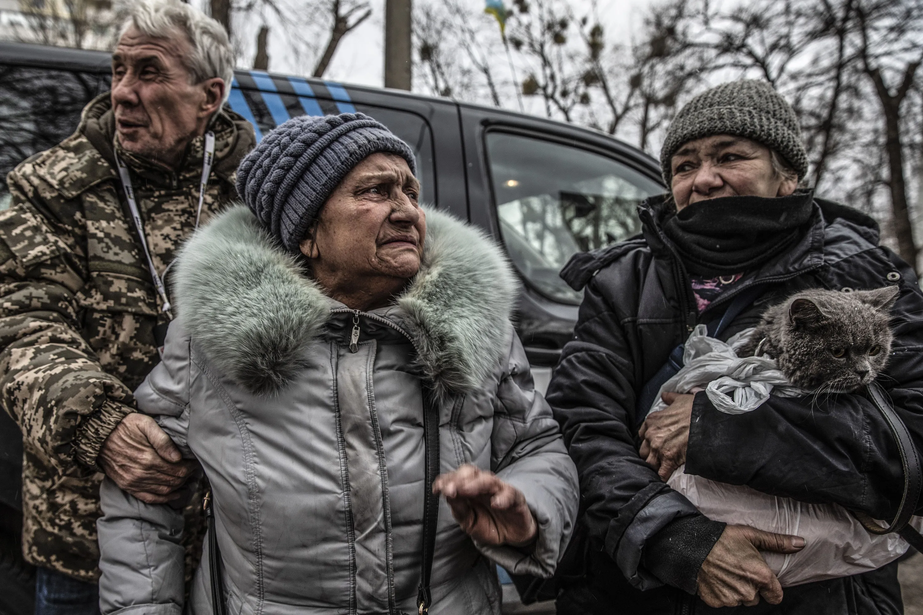Tatyana Symenonko, 68, clutched her British shorthaired gray cat in a plastic bag to her chest as she arrived with others who fled the city of Irpin through a safe corridor into Kyiv, Ukraine, on March 27,2022. (Photo by Heidi Levine for The Washington Post)