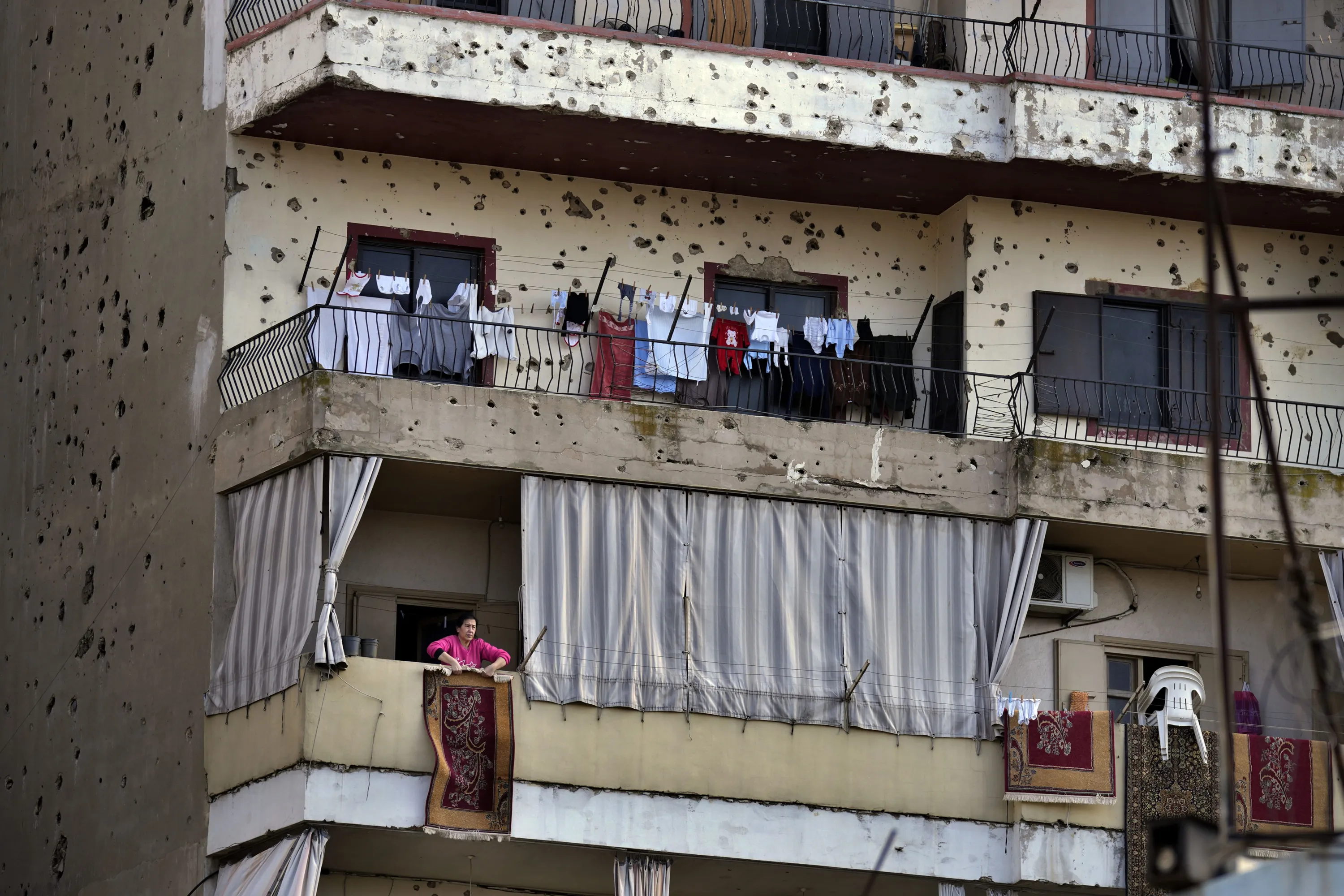 A woman hangs a rug on her balcony riddled by bullets from clashes between pro and anti-Syrian government groups, in Tripoli, Lebanon, February 16, 2022. Often known in recent years for sectarian and other violence, Tripoli seems an unlikely place for a cultural revival, but it has a long cinematic tradition, once boasting 35 movie houses and Lebanon's first cinema. Kassem Istanbouli, a 35-year-old actor and director is now seeking to restore some of that past glory by turning the city’s long abandoned Empire Cinema into a national theater. (Photo by Bilal Hussein/AP Photo)