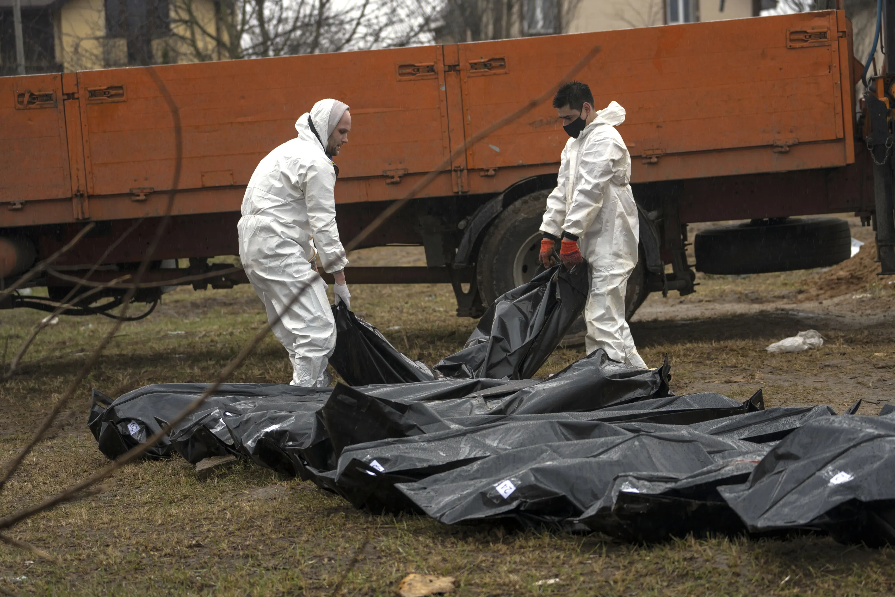 Cemetery workers carry a corpse of a man from a mass grave to be identified in a morgue, in Bucha, on the outskirts of Kyiv, Ukraine, Sunday, April 10, 2022. (Photo by Rodrigo Abd/AP Photo)