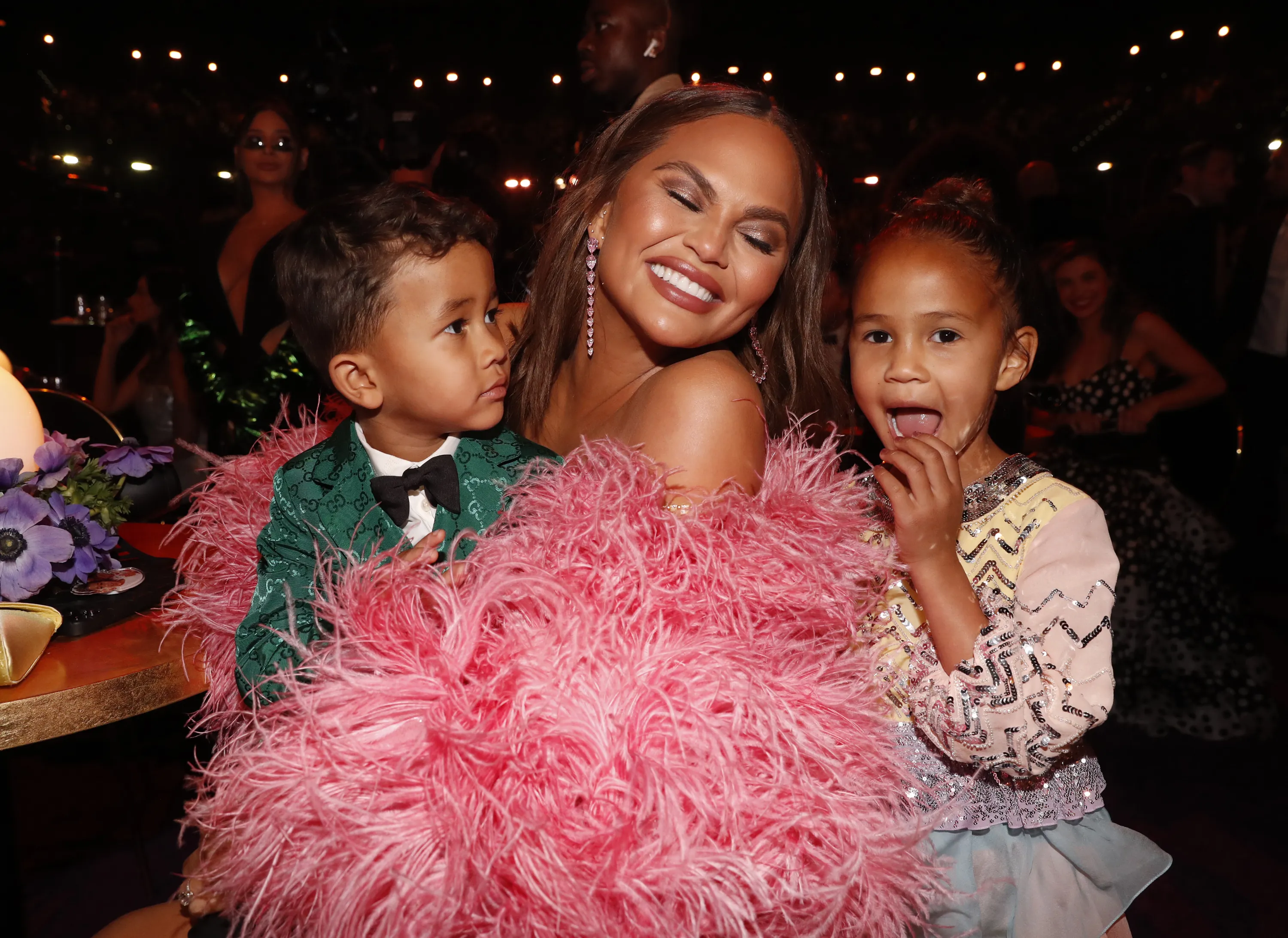 (L-R) Miles Stephens, Chrissy Teigen, and Luna Stephens attend the 64th Annual GRAMMY Awards at MGM Grand Garden Arena on April 03, 2022 in Las Vegas, Nevada. (Photo by Johnny Nunez/Getty Images for The Recording Academy)