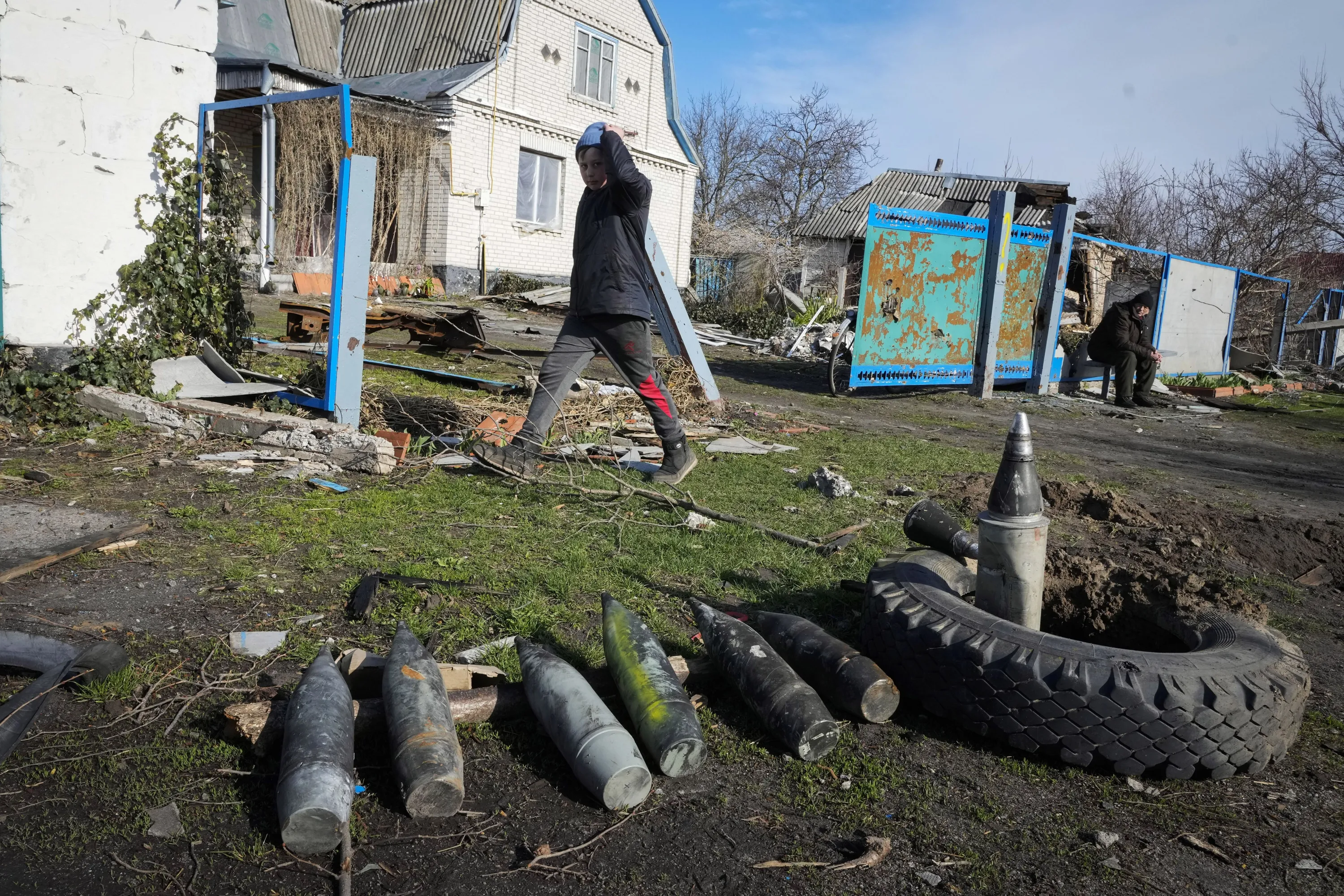 A boy walks by unexploded Russian shells in the village of Andriyivka close to Kyiv, Ukraine, Monday, April 11, 2022. (Photo by Efrem Lukatsky/AP Photo)