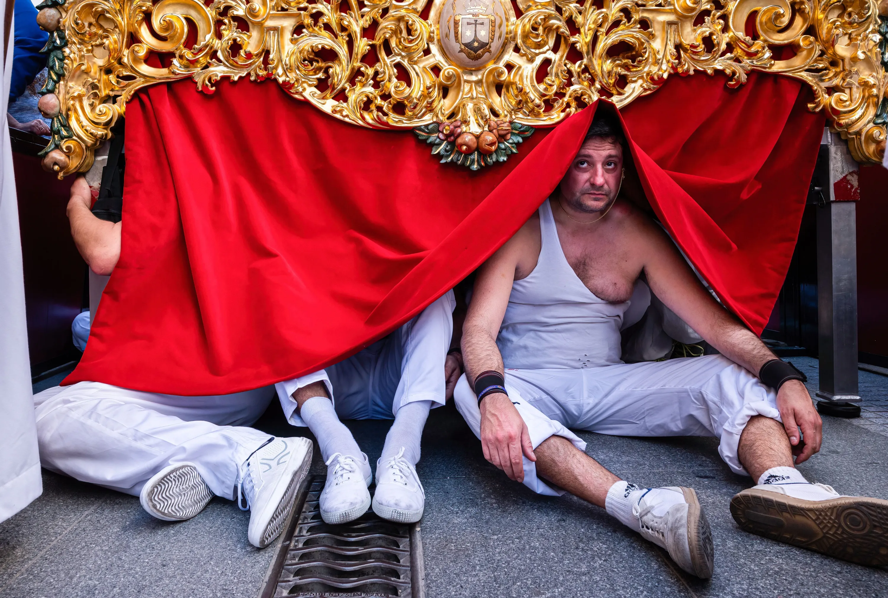 Penitents take a rest during a procession to celebrate Palm Sunday, also called Passion Sunday, the first day of Holy Week and the Sunday before Easter, commemorating Jesus Christ's triumphal entry into Jerusalem after two years of Covid-19 travel restrictions and cancellations in Cadiz, Spain on April 11, 2022. (Photo by Miguel Candela/SOPA Images/Rex Features/Shutterstock)