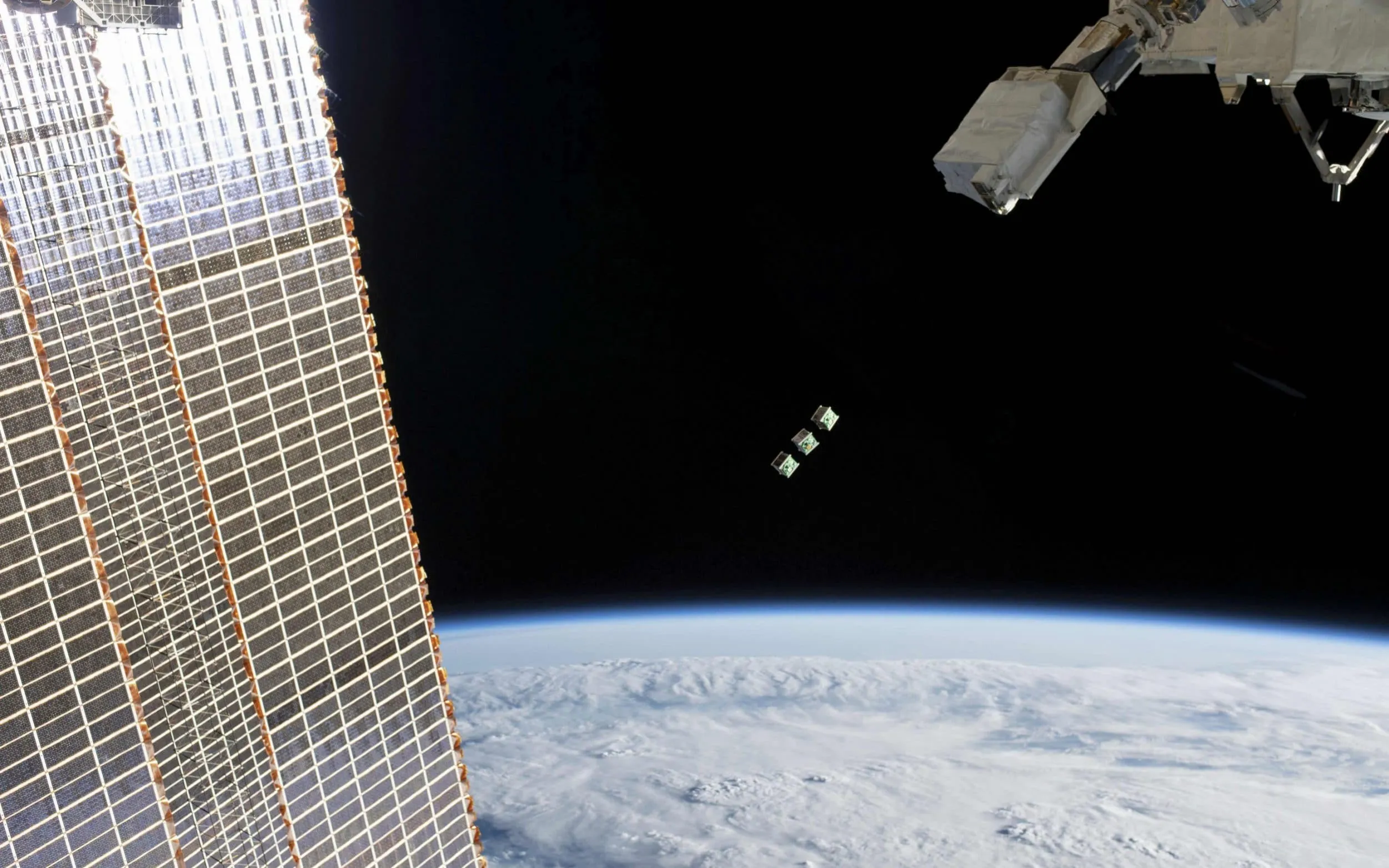 This NASA photo obtained released June 19, 2019 shows a set of three CubeSats pictured shortly after being ejected from the Japanese Small Satellite Orbital Deployer attached to a robotic arm outside of the Japan Aerospace Exploration Agency's Kibo laboratory module on June 17, 2019. The tiny satellites from Nepal, Sri Lanka and Japan were released into Earth orbit for technology demonstrations.The International Space Station was orbiting 256 miles above the Amazon River in Brazil when an Expedition 59 crewmember took this photograph. (Photo by Handout/NASA/AFP Photo)
